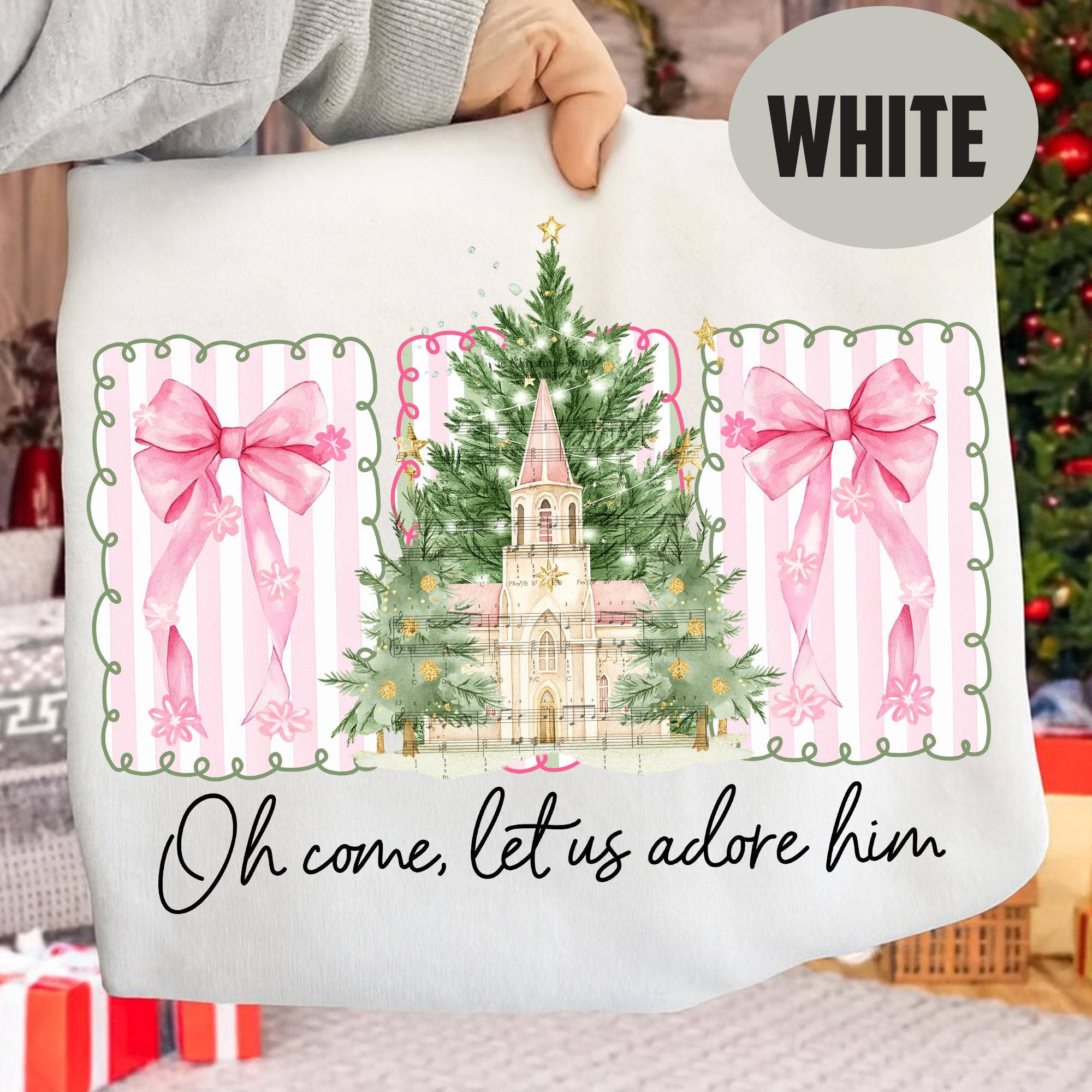 Celebrate the season with a design that blends joy and faith in a colorful, festive way. This O Come Let Us Adore Him tee features a charming pink chapel framed by holiday trees and bows, wrapped in a playful border that makes the message shine even brighter. Perfect for Christmas gatherings, church events, or simply sharing your love for the season, this design is both meaningful and eye-catching. The bright pops of pink and green give it a boutique feel that stands out while keeping the focus on the true reason for the season. Comfort Colors : Bay 6.1 oz./yd² (US), 10 oz/L yd (CA), 100% ring-spun cotton, 30 singles Garment dyed for that lived in feel and almost no shrinkage at home. Soft ring-spun cotton fabric with 100% cotton threads Relaxed fit Topstitched, classic width, rib collar Shoulder to shoulder twill tape Signature twill label Made With Respect Proud member of the U.S. Cotton Trust Protocol Made with OEKO-TEX certified low-impact dyes Our clean pigment dye colors are salt free