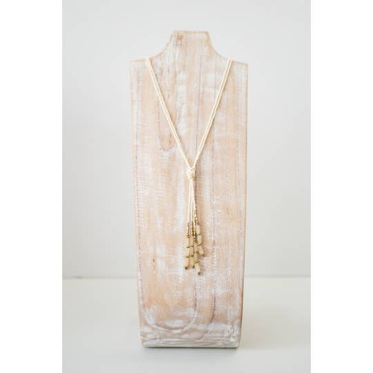Beaded necklace combining two classic styles, the lariat and the bolo tie necklace. DETAILS â–¶ Japanese glass beads, hand beaded on sturdy nylon cord. Solid brass beads on each end. â–¶ Total length: 34" â–¶ How to wear: Slide the striped beaded end away from the beaded loop until the loop reaches the end, then slide over head; adjust as desired. Wear layered with a shorter necklace, or on its own. *Shown layered with choker necklace in first photo.* â–¶ Style Inspiration: Convert into a bolo necklace by added a vintage clip-on earring over the loop. CARE Avoid direct contact with perfumes as they may discolor glass beads.