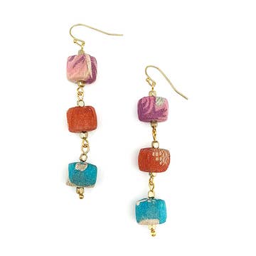 These beautiful fused glass earrings are created from upcycled single windowpane glass by a women's collective in Ecuador. Mixed colors -- each pair is unique! Size of long stem earrings: .25" x 1.5" Earwires are made of surgical stainless steel. Fair trade.