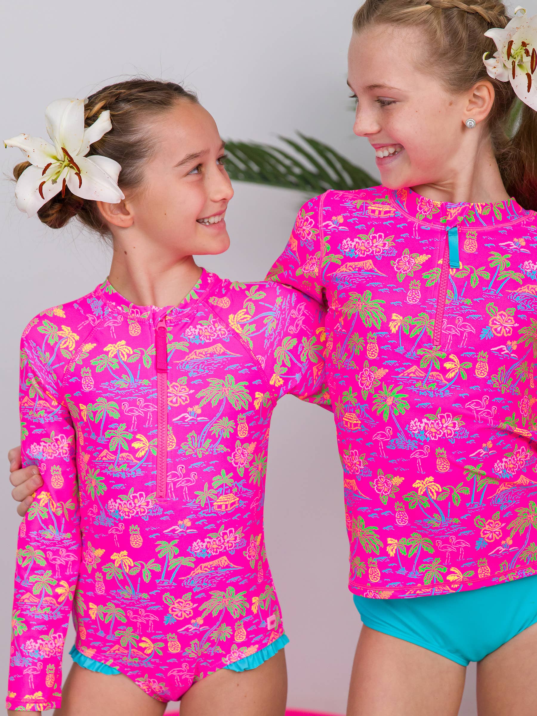 This girl's One Shoulder Ruffle One Piece is a perfect vacation outfit. With stylish shoulder straps and fun colors, your little one will be looking her best while having fun in the water. Keep her also safe from the sun with this fully lined, UPF 50+ sun protected fabric. Neon pineapples dance up and down in this fruity and tropical print! Pairs well with Neon Violet, Neon Lime, Neon Yellow, Bright Aqua, Neon Orange. Care Instructions: Hand wash cold with like colors; do not bleach; do not iron; line dry in shade Fabric Content: 80% Nylon, 20% Spandex Reference Code: G3691