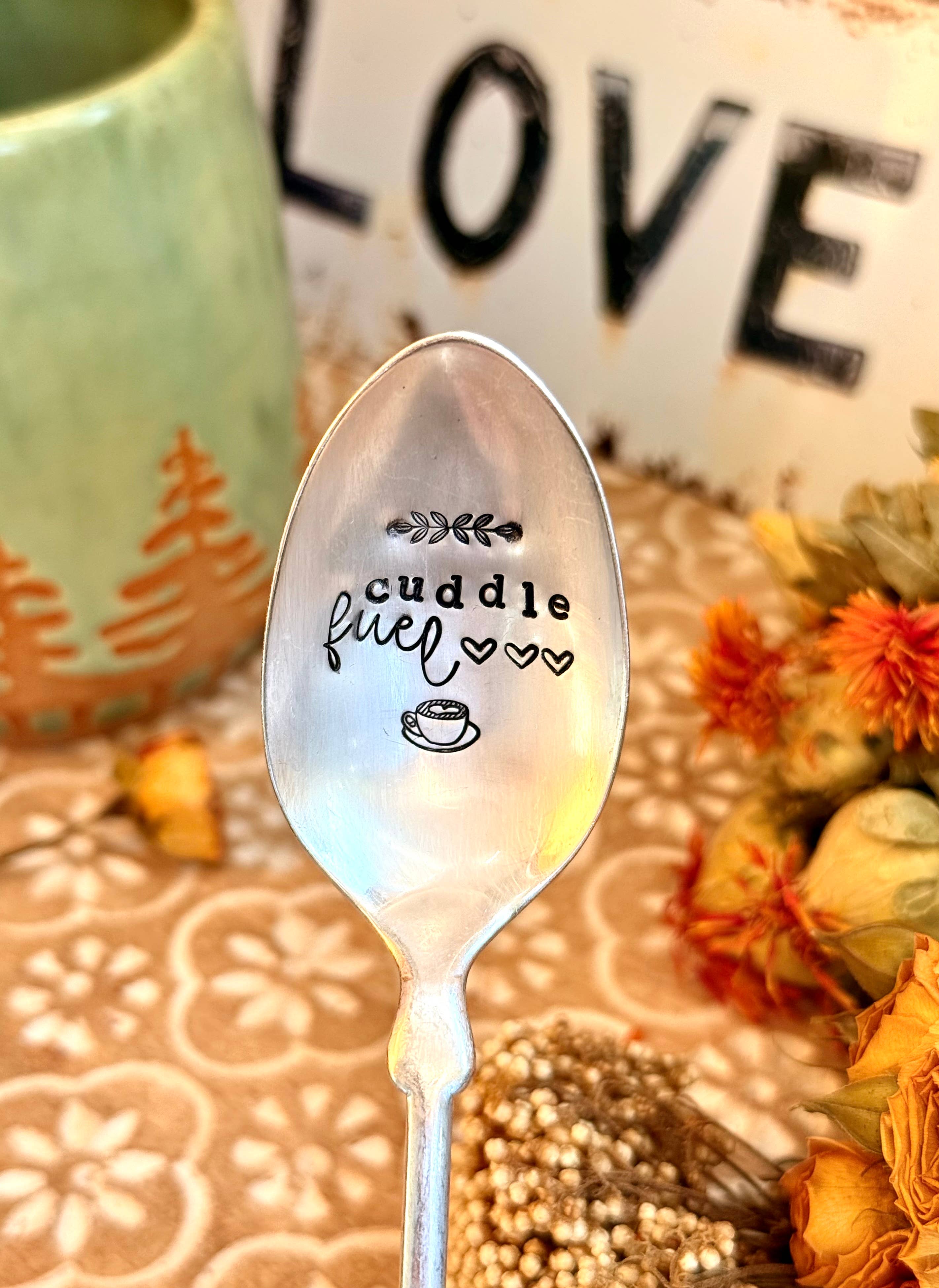 Hand stamped “Jesus & Coffee”. This is for ONE spoon. These are vintage spoons so there will be imperfections! They may not resemble the same spoons in the picture either as those are examples. They are hammered and stamped with the wording. Spoons will vary in size. color and metal (meaning patina or tarnish). Each spoon will be different which adds to the uniqueness of this set. PLEASE NOTE! These are very old spoons and should be wiped clean with a damp rag. They should not be placed in the dishwasher or be soaked in any water as it can ruin the metal/ wording. Every effort is made to ensure the item you receive matches the photos displayed, there may be some slight variations. Variations in color may also occur based on computer monitor settings.