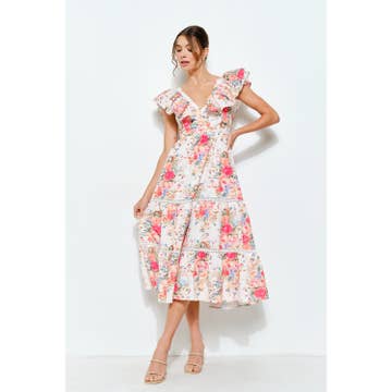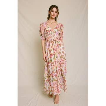 Product Details: - Floral Lace Long Sleeve Tiered Midi Dress
