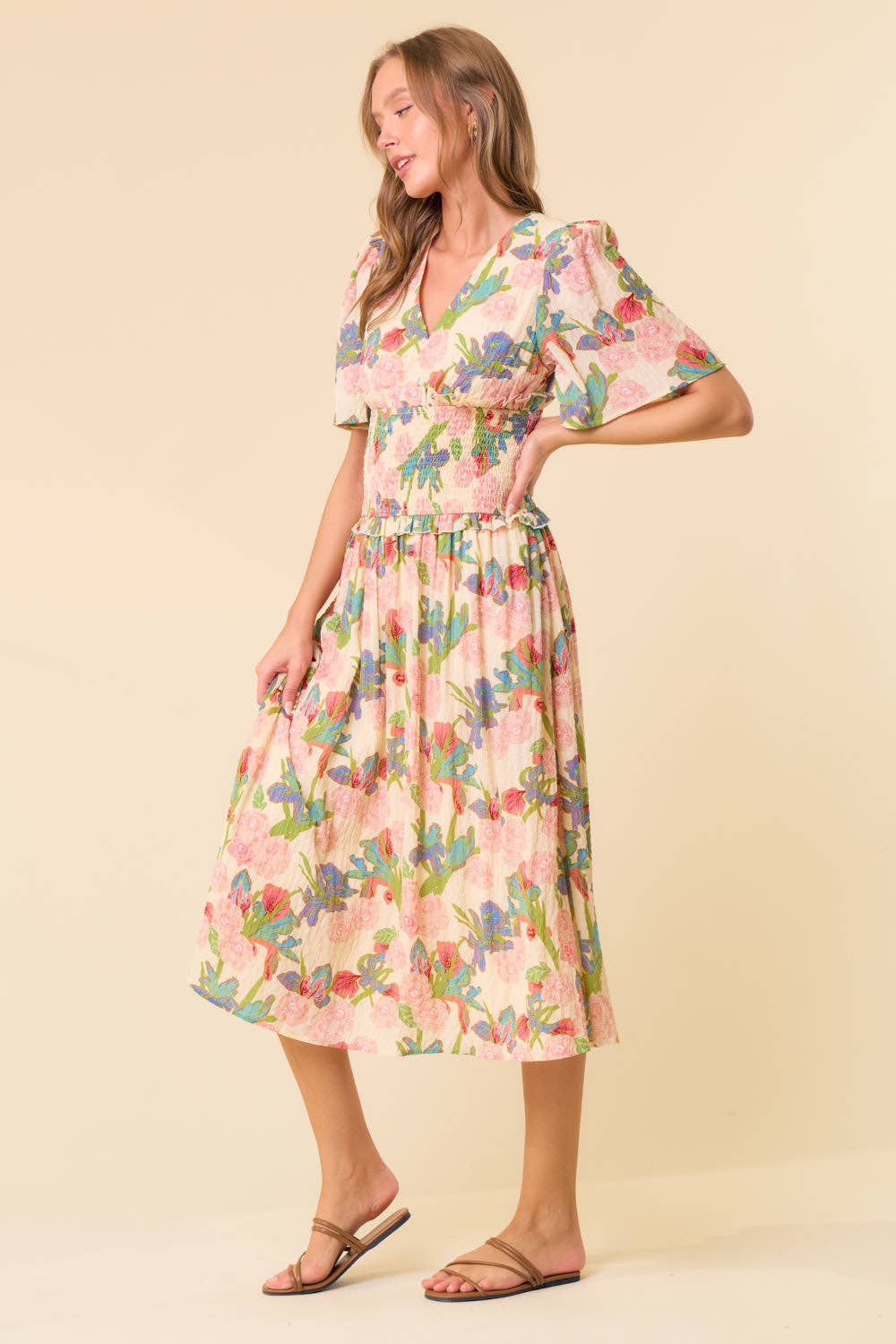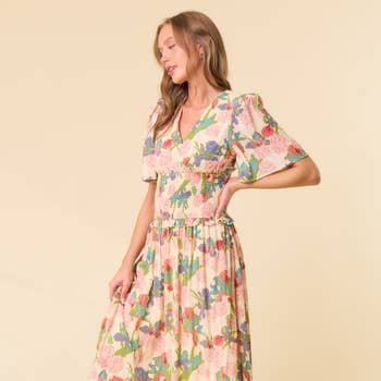 SKU: 33672SR, 33672SR, 33672SR, 33672SR Made in China Aesthetic: Classic and Romantic / whimsical Care Instructions: Machine wash Dress Style: Sundress Embellishment: Ruffles Fit: Contemporary Neckline: V-neck Occasion Theme: Everyday Occasion: Everyday and Formal Pattern: Floral Season: Spring/Summer Skirt & Dress Length: Midi Sleeve Length: Long Sleeve Product Language: English Fabric: Self: 92% Polyester 8% Spandex\ Lining: 100% Polyester