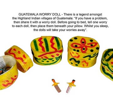 Add a bit of Mayan magic to your life with this Set of 12 Guatemalan Worry Dolls. Beautifully handcrafted and Fair Trade sourced, the dolls feature 100% cotton fabric and nylon doll faces with wooden accents for a unique and stylish look. Perfect for children and adults alike, these worry dolls are sure to bring you peace of mind. * Sold as Sets of 12 * Each Doll: 2 1/4'' x 1/2'' * 100% Cotton Fabric * 100% Nylon Doll Face * Wooden Accents * Assorted Designs & Colors * Comes with a Worry Doll Story Card According to Guatemalan tradition, children tell their worries to the worry dolls and then place them under their pillow when they go to bed at night. The worry dolls shoulder the responsibility of the problem, freeing the worrier and allowing them to sleep peacefully. Come morning, the dolls have gifted the worrier the knowledge and wisdom to eliminate their worries. Warning: CHOKING HAZARD – Small Parts. Not for Children Under 3 years.