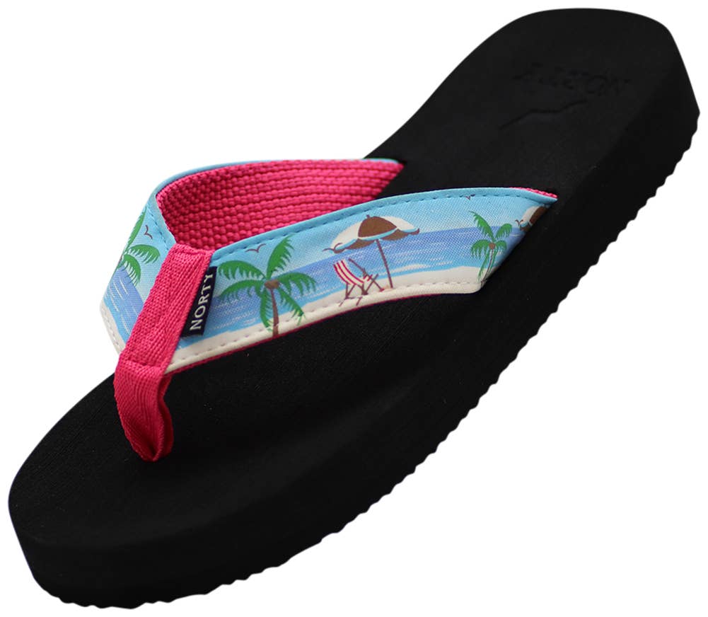 Buy the 12 unit prepack size run: 11-12-13-1-2-3-4 size scale: 1-2-2-2-2-2-1 norty little girls flip flop thong sandal, send him to the pool or beach in these comfortable flip flops, soft fabric straps, fabric between the toes for added comfort, 1/2 inch cushioned platform with prints on top of footbed and striping around the outer part, man made materials, sealed bag 42248