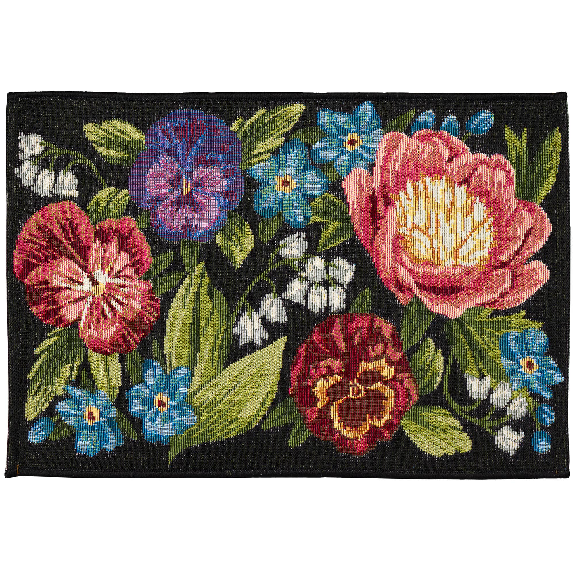 This cheerful garden mat of fully blooming flowers will brighten everyone’s day as they enter your home, in black. Made in Egypt from 75% polypropylene/25% polyester, reinforced with a latex non-skid backing, the Esencia Collection is Power Loomed to create intricate designs with a broad color spectrum and a high-quality finish. The material is flatwoven, low profile, weather resistant, UV stabilized for enhanced fade resistance, durable and ideal for those high traffic areas such as your patio, sunroom, kitchen, entryway, hallway, living room and bedroom making this the ideal indoor or outdoor rug. Detailed patterns are offered in an eclectic mix of styles ranging from tropical, coastal, geometric, contemporary and traditional designs; making these perfect accent rugs for your home. Limiting exposure to rain, moisture and direct sun will prolong rug life.