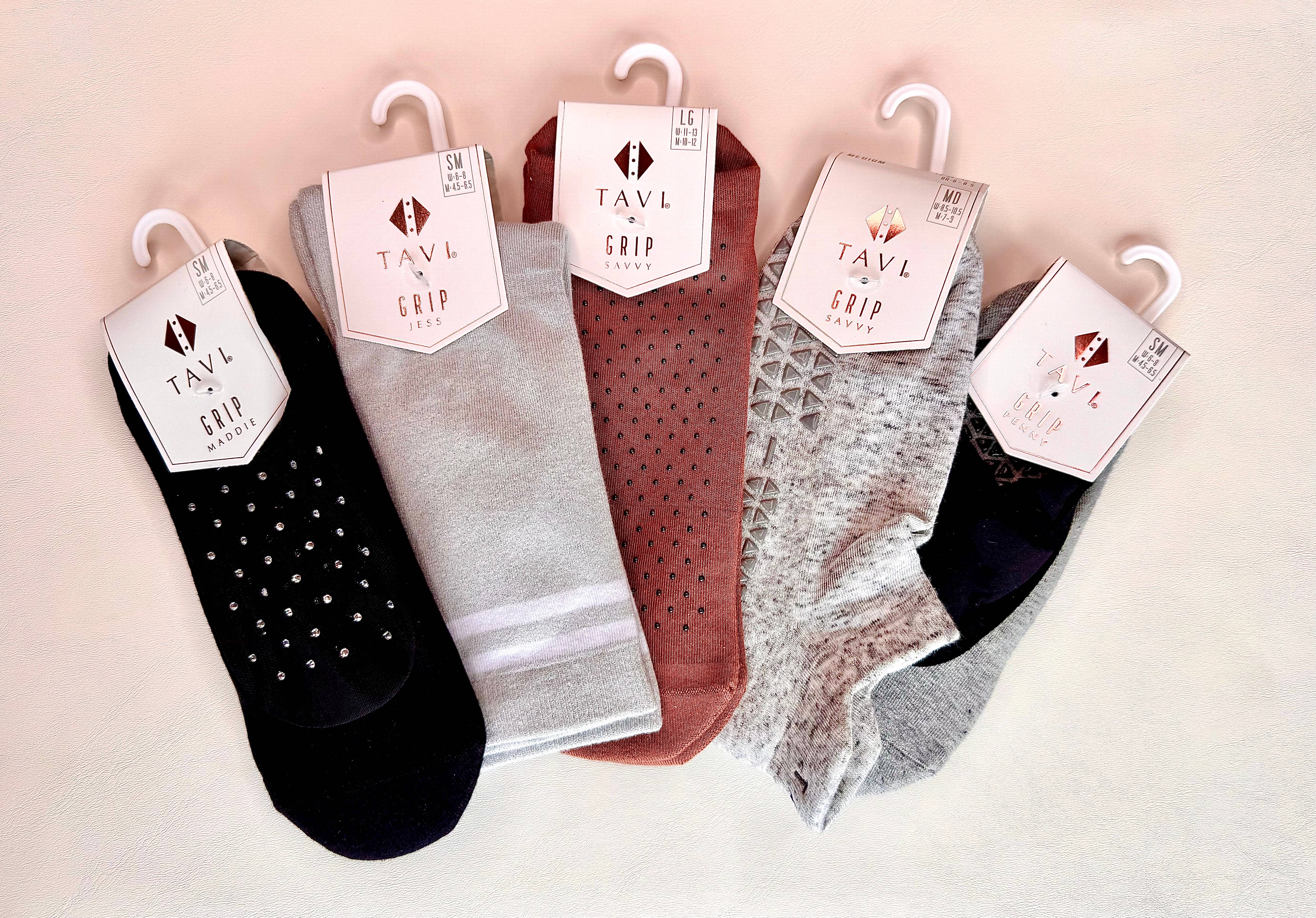 Stay cool in the Maddie grip sock with chic mesh. Her low profile design hugs just below the ankle while Tavi's stellar grip sock pattern safely moves you through barre, pilates, and yoga classes. Hygienic alternative to bare feet; protects against dirt + germs on floor and equipment. Technical features: arch band supports and comforts, high-density PVC grip sole, soft organic cotton, and heel tab protects Achilles.