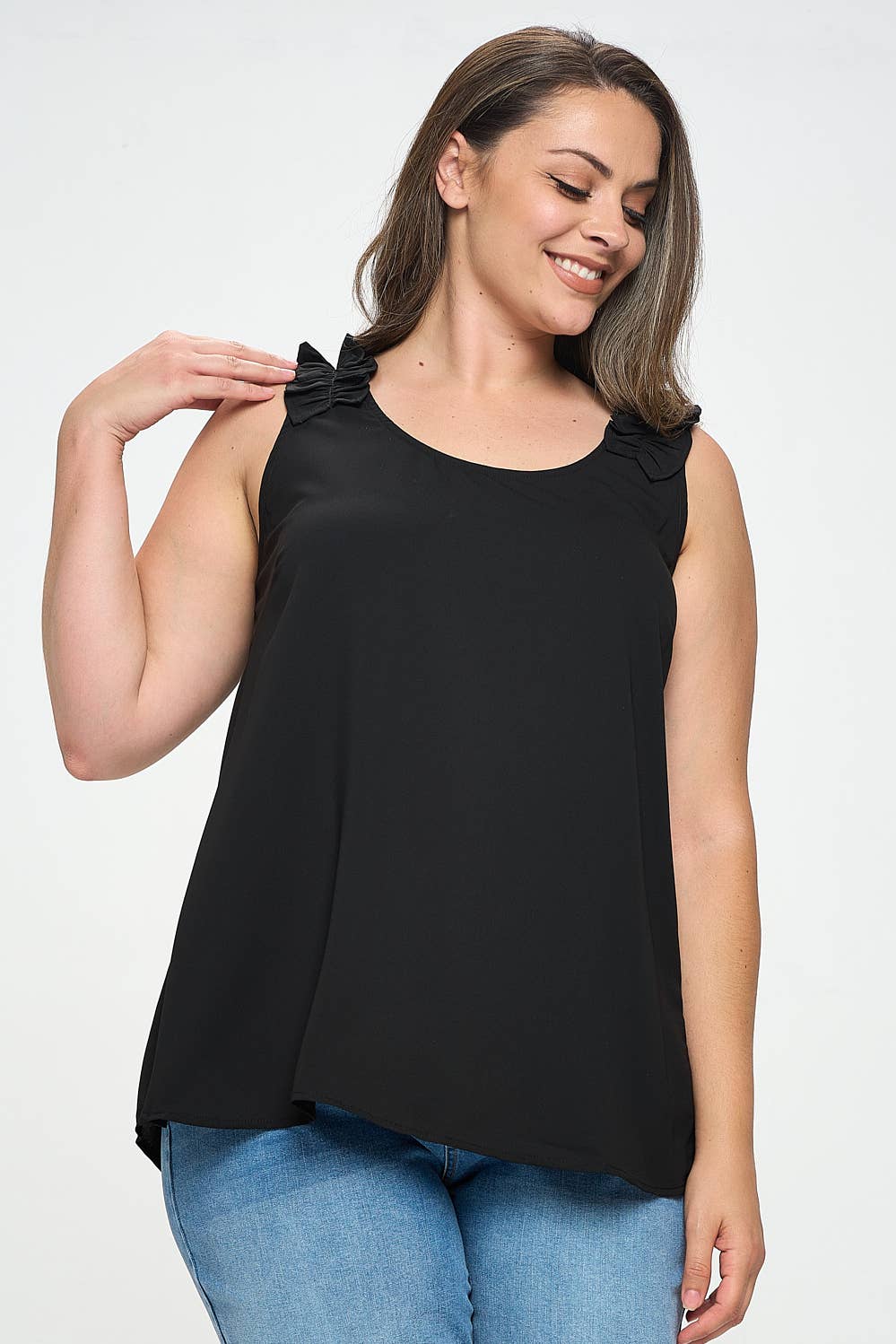 Plus size solid top with off the shoulder sleeves, shirring detail, and spaghetti straps by Haute Fox