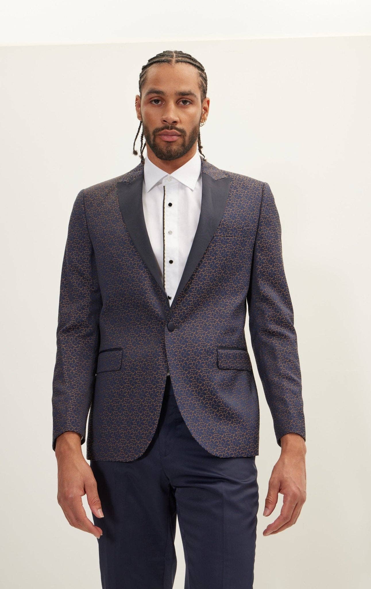 Details: * Slim fit: cut with a narrow point-to-point shoulder measurement and higher armholes * Slim Fit * Shiny crystals, rhinestones, and beads on the collar * Shiny metallic lightweight fabric * Peak lapel collar * Long sleeve * One-button closure * Front welt chest and hip pockets * Interior pocket Fabric & Care: * Dry clean only. * 100% Regenerated fiber Packing information: * Open stock, You can order any quantity and any size.