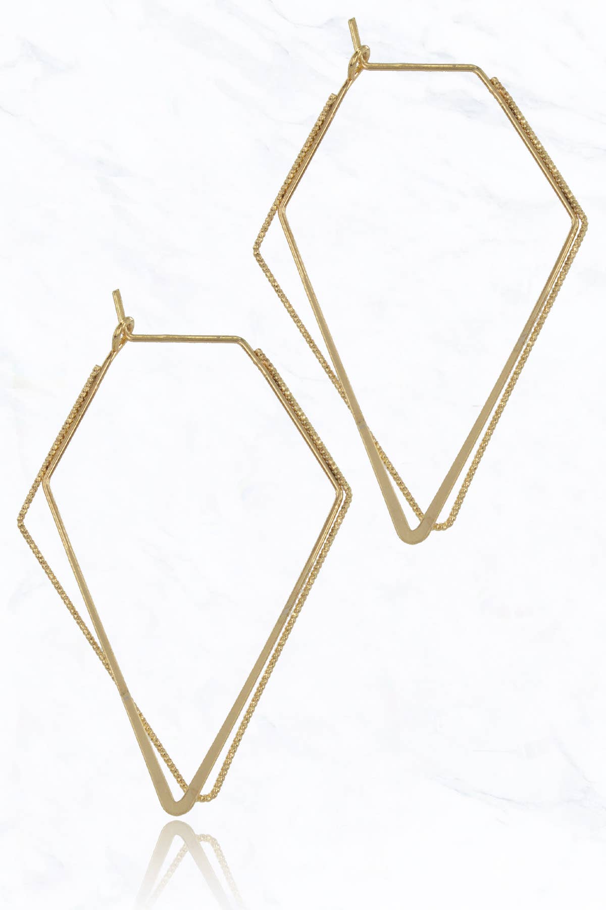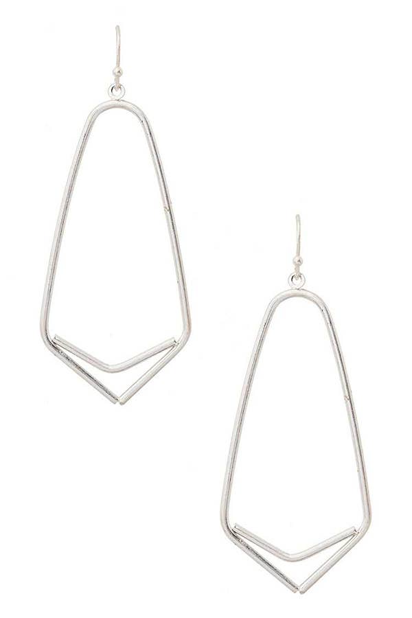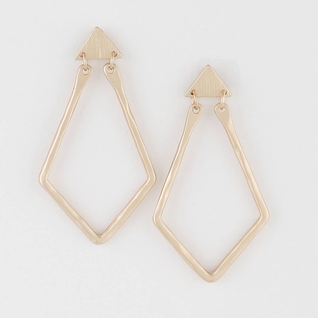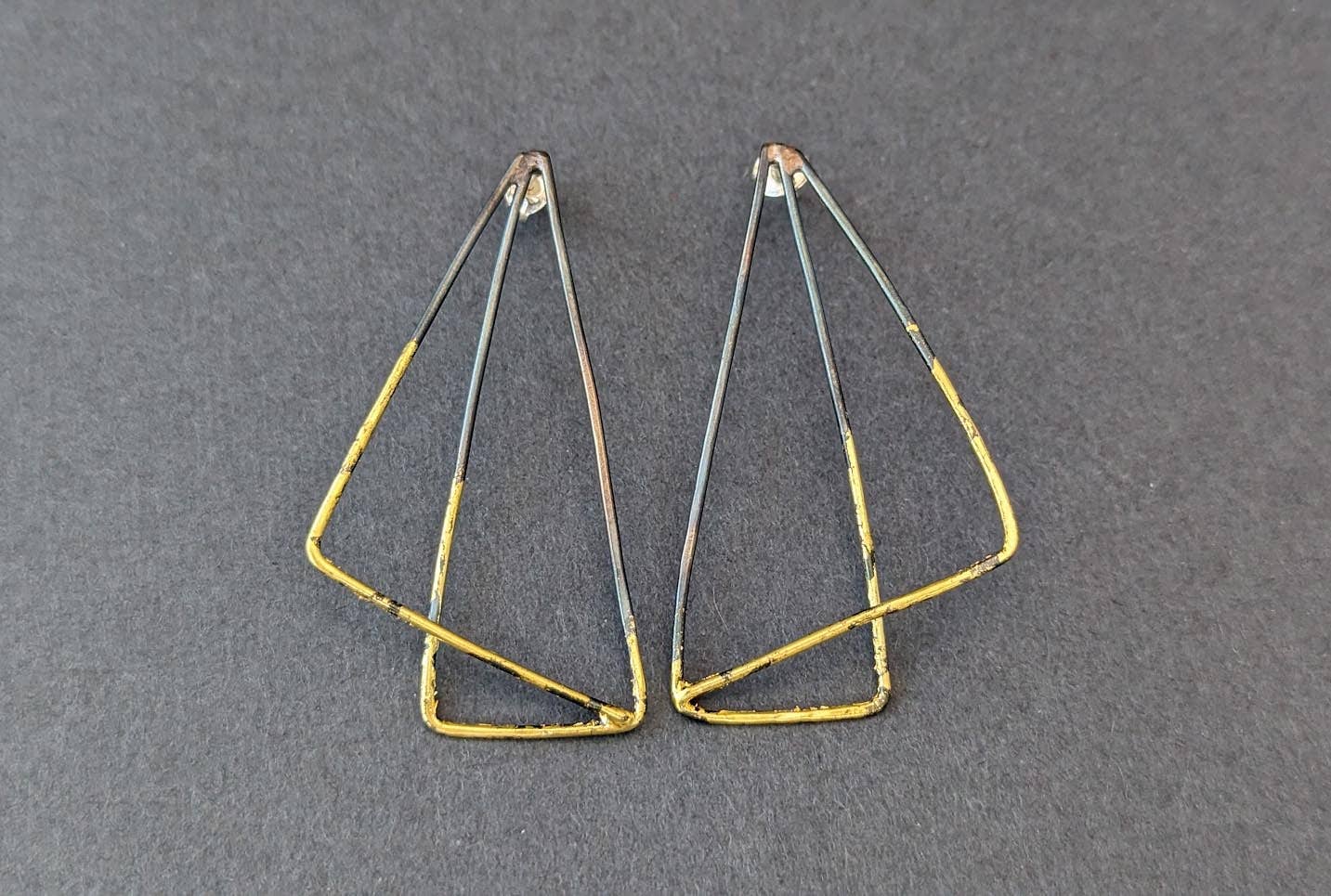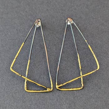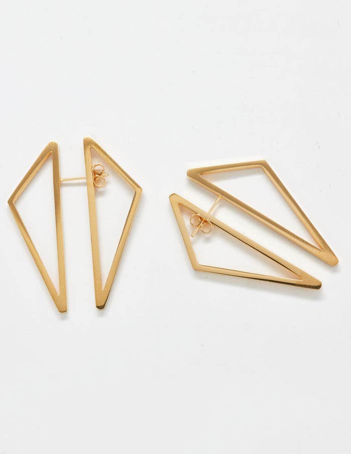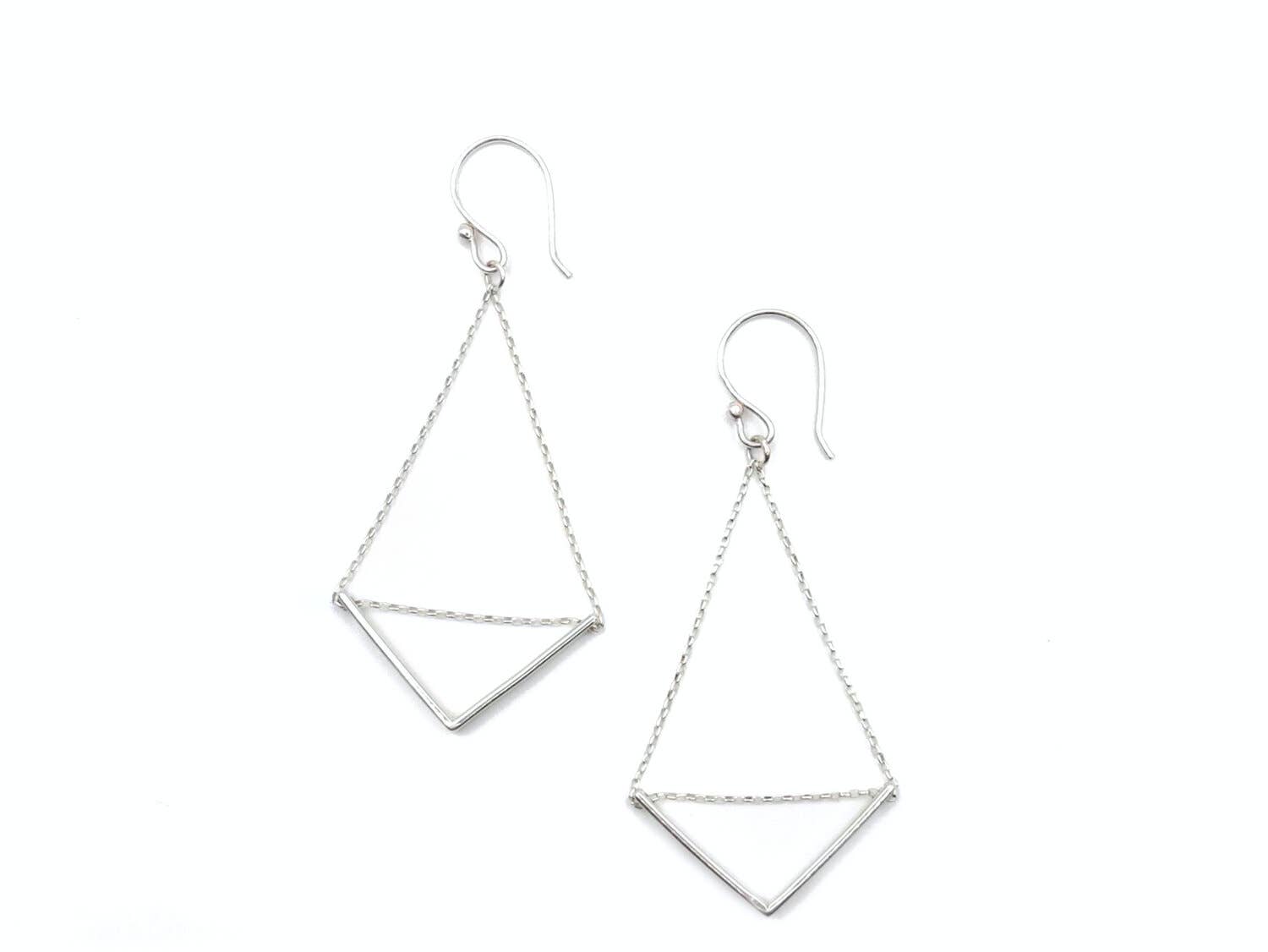 These delicate ear drapes are formed of two interlocking triangles with dainty ear threaders. They swing back and forth gently and add the perfect amount of geometric fun to any outfit. Materials All metals are brass finished with plating (see below) Finishing 12K Gold, Rhodium, *Black Zinc on brass (*Nickel Free) Dimensions the linked triangle component measures 1" x 2" the threader and chain is 2 1/2" long