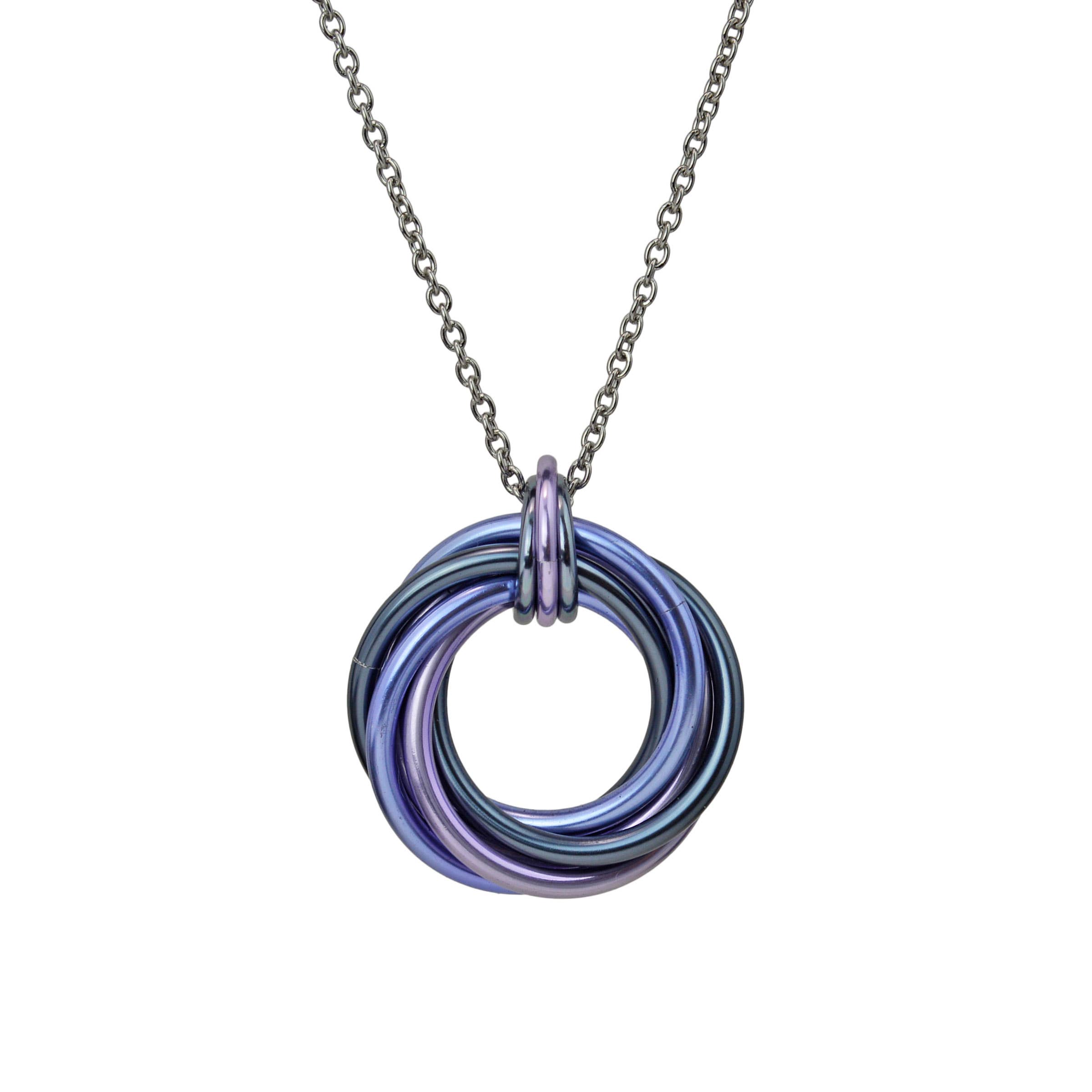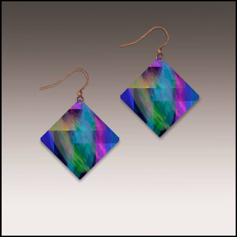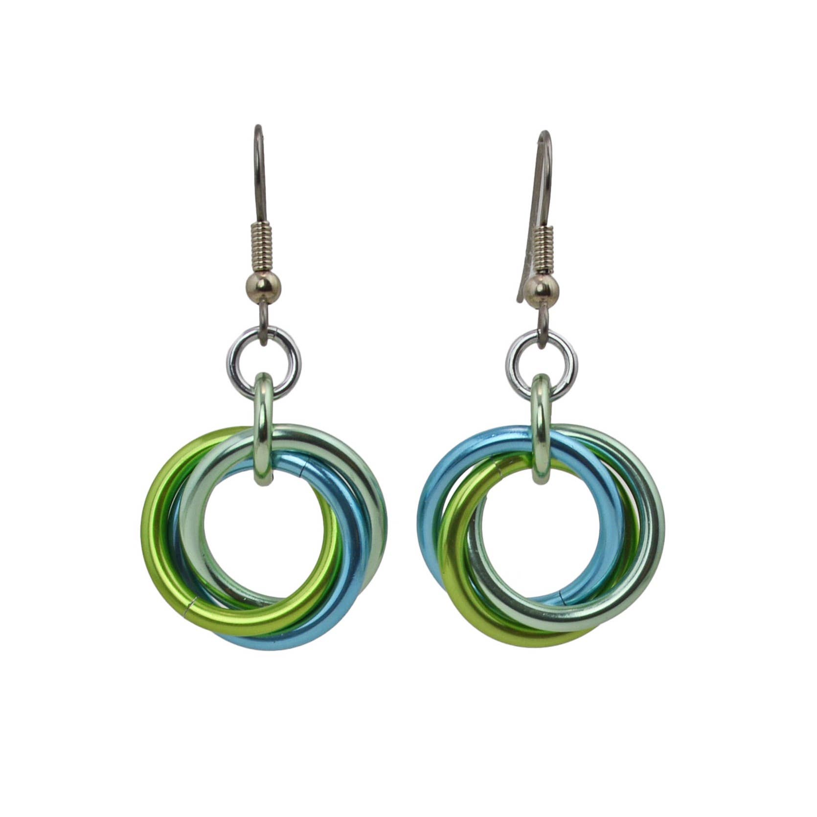 Three "knots" of metal elegantly cascade in a long drop shape. These earrings are extremely lightweight. Anodized aluminum with gold-plate ear wire. Rubber ear backs included. Measures just over 2" long. COSMIC UNICORN ombre - seafoam, light blue, lilac