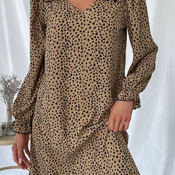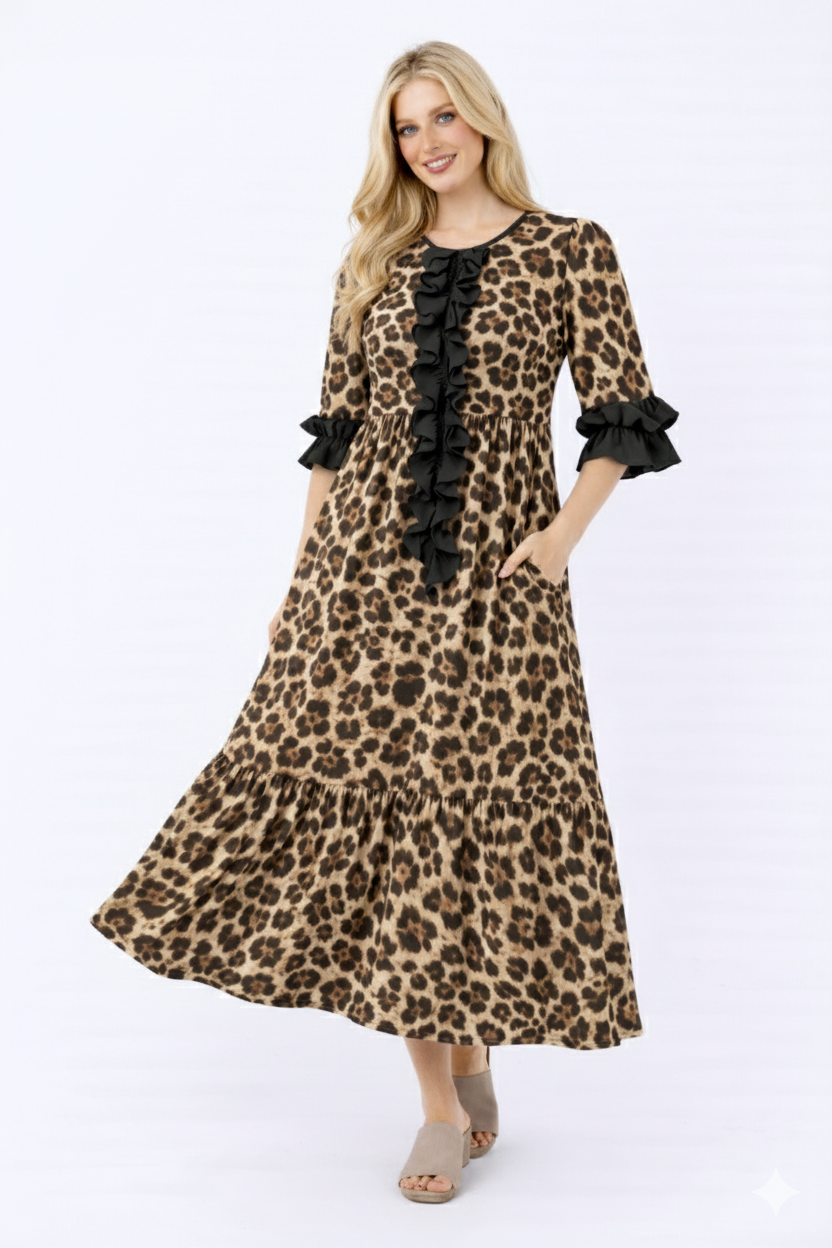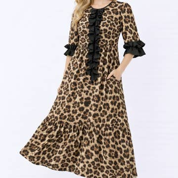 ** ONLY SOLID COLOR CHANGES ** 95% RAYON 5% SPANDEX LONG SLEEVE ROUND NECK SOLID AND ANIMAL LEOPARD PRINT CONTRAST DRESS WITH RUFFLED DETAIL MODEL SIZE: HEIGHT 5'7", BUST 32", WAIST 24", HIPS 34.5" WEARING SIZE: SMALL *The garment color may differ slightly upon arrival due to being taken with professional lighting also depending on what device you maybe using to shop*