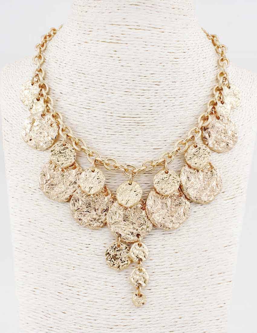 Golden charms mixed with crystals and faux pearls creating a unique bib charm necklace. Classic charm necklace with a modern look.