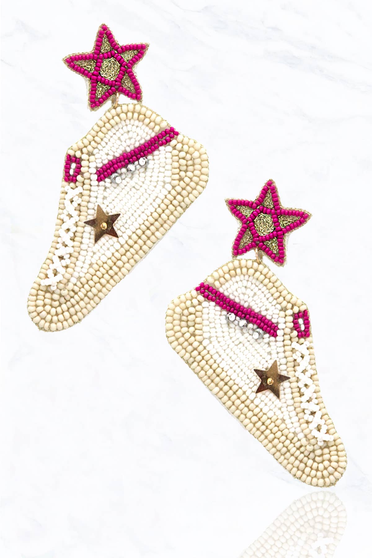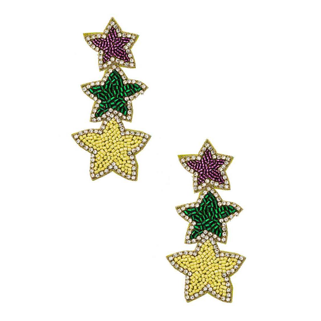 These half star earrings made of handwoven Japanese Miyuki glass beads are truly special. Each statement earring is made from 3 separate diamonds formed from 14 distinct shades of beads and carefully sewn together to create a beautiful half star shape. Although large they are very lightweight and are comfortable to wear. A stainless steel post is sewn on the back with nylon thread. These earrings are handmade by women artisans from vulnerable communities in Medellin, Colombia who receive fair working conditions and compensation for their skills. Materials Miyuki Glass Beads Stainless Steel Post Size Length 2.8 Inches Width 1.5 Inches *This style is available in several color ways. **The last photo is added to show our merchandising earring cards.