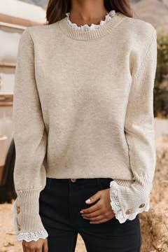 Wholesale Lace Trim Buttoned Cuffs Sweater | S-XL