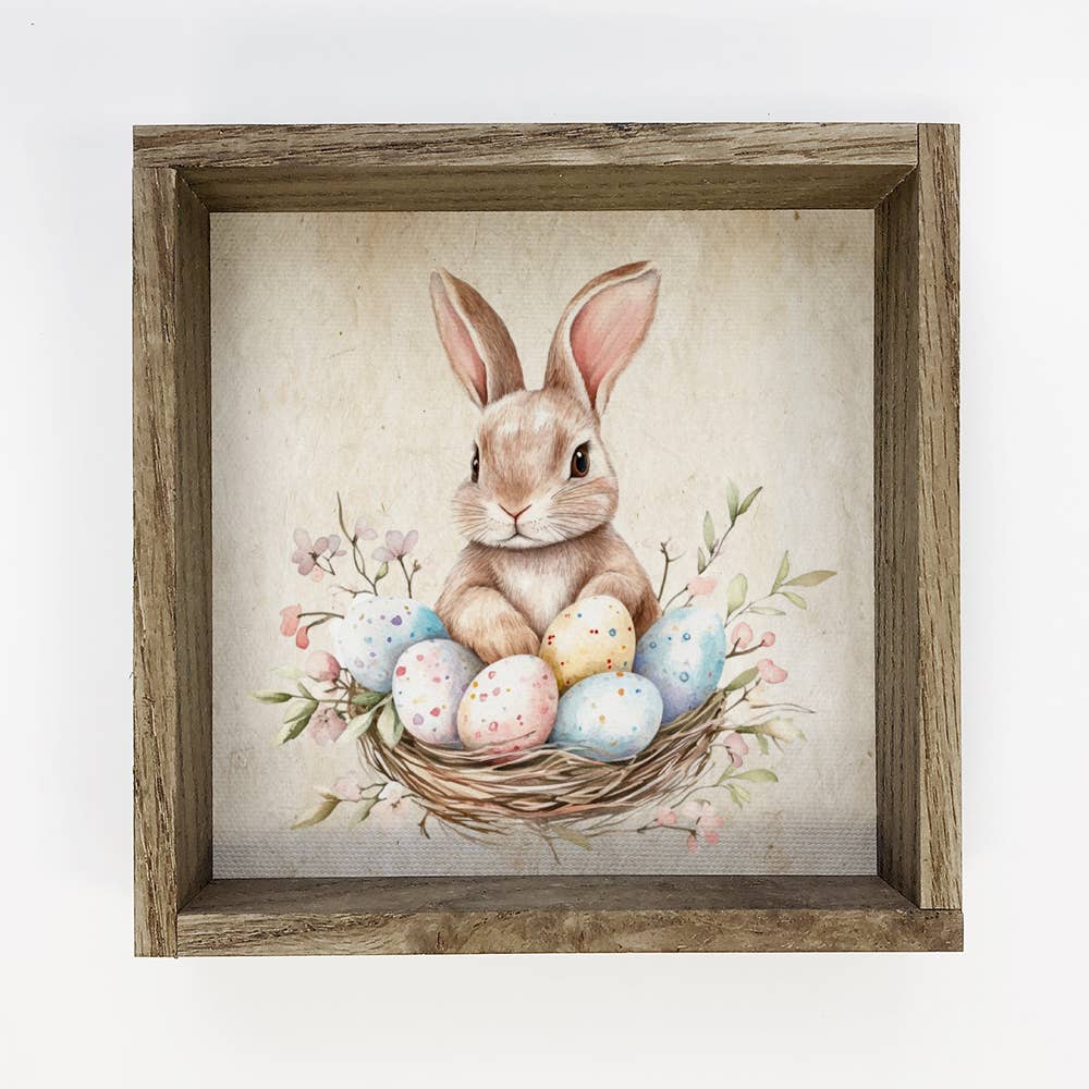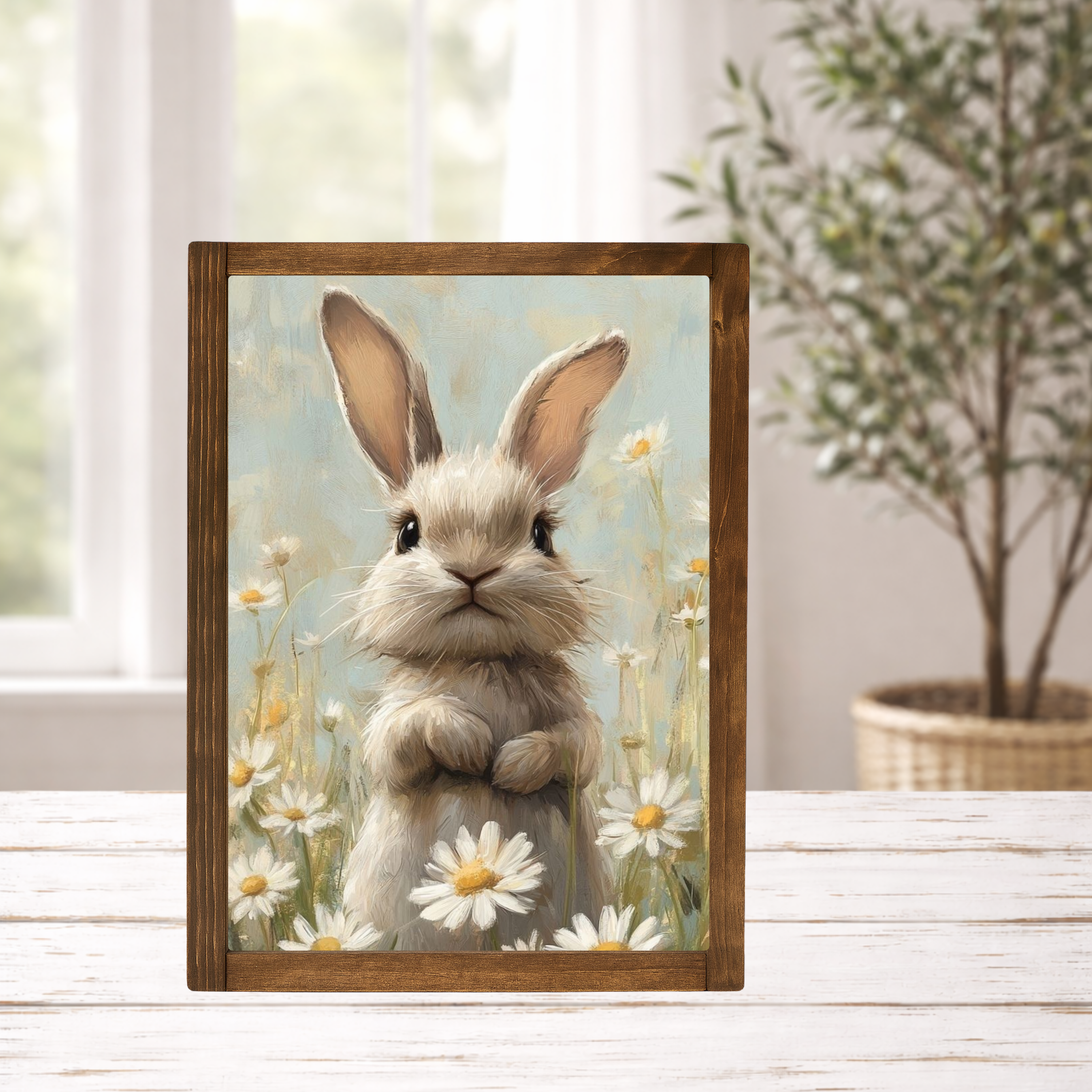 This Box Frame is called "Brown Easter Bunny Portrait" and is available in a variety of sizes. In this picture a brown bunny rabbit with soft, velvety fur and bright, gentle eyes sits at the center of the portrait. It wears a pastel spring-themed bow tie with pink and blue florals. The textured background adds contrast and depth, highlighting the bunny’s sweetness and the cheerful bow tie. The overall feel is warm, charming, and perfectly spring-like. It is UV protected so you will never have to worry about fading! The Poplar wood frame is espresso stain and will add about one inch per side with an amazing 1.5 inch thickness. The Box Frame also gives you options, you can hang it from the wire hanger that is attached to the back, or you can sit it on a flat surface!