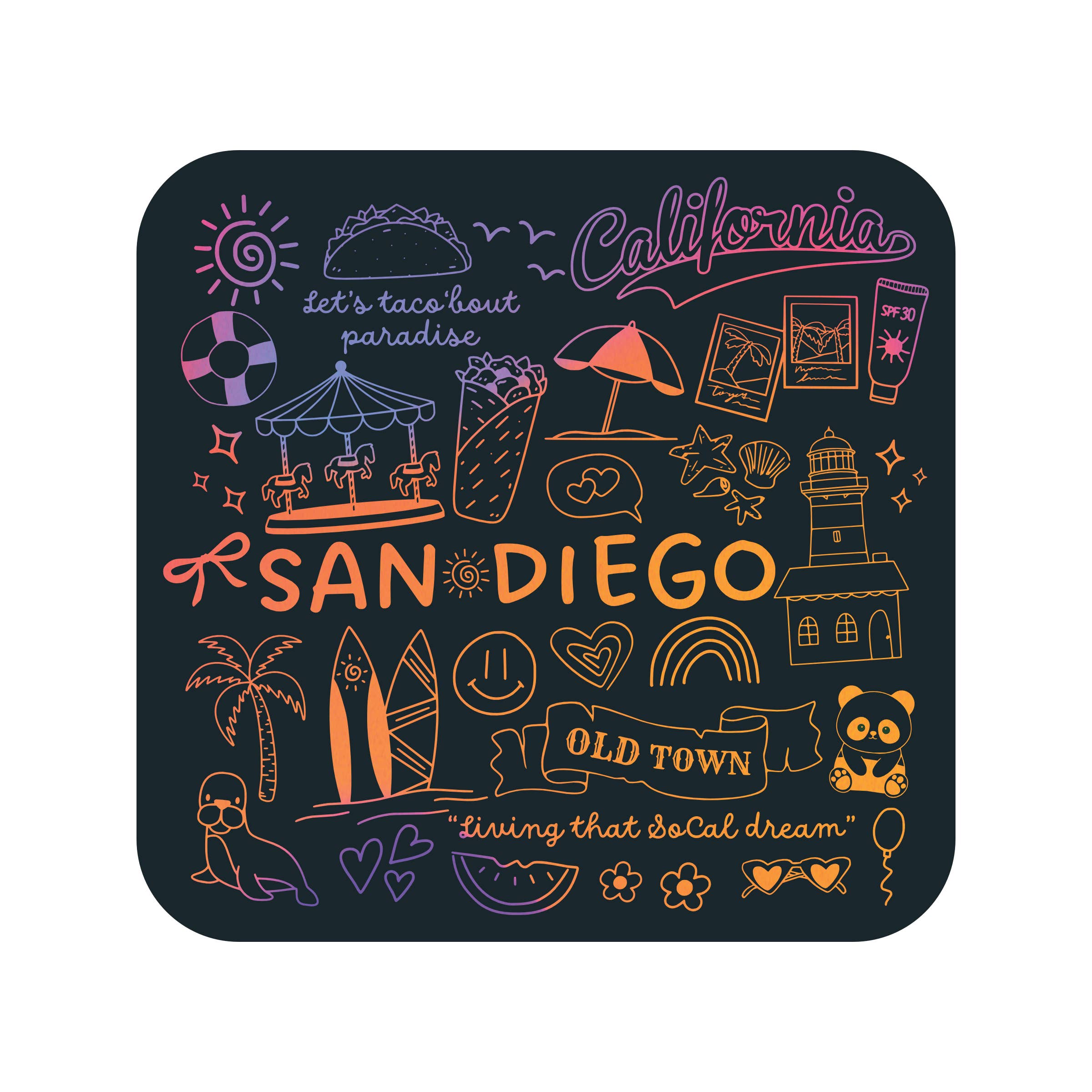 Catch a wave with this colorful San Diego sticker! This vinyl, waterproof sticker features a light brown and yellow (a nod to the iconic baseball team!) surf van decked out in California poppies, a sailboat, sun and groovy hand-lettering. • 3 x 1.7 inches • Thick, durable vinyl • Waterproof • Made in the USA