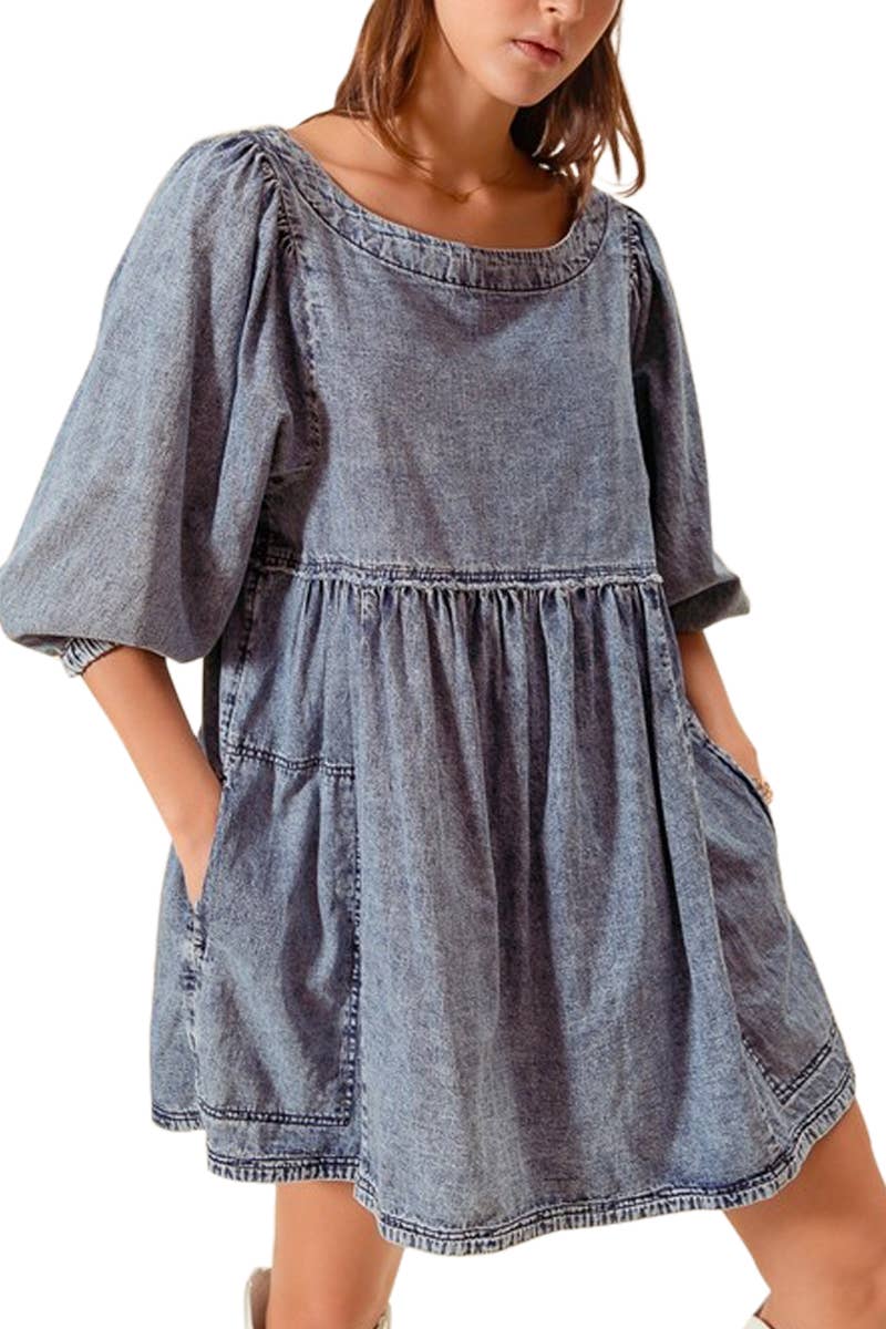 -Imported -Dark washed denim -Elstatic deep v-neck -Elastic waist back -Puff 3/4 sleeve -Flaire skirt line -Mini length Handwash Cold 100% Cotton Model is 5'10" and wearing a size Small.