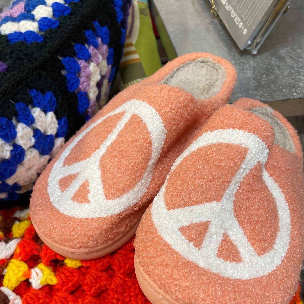 Peace Symbol Illustrated Plush Fur Slip on Slippers