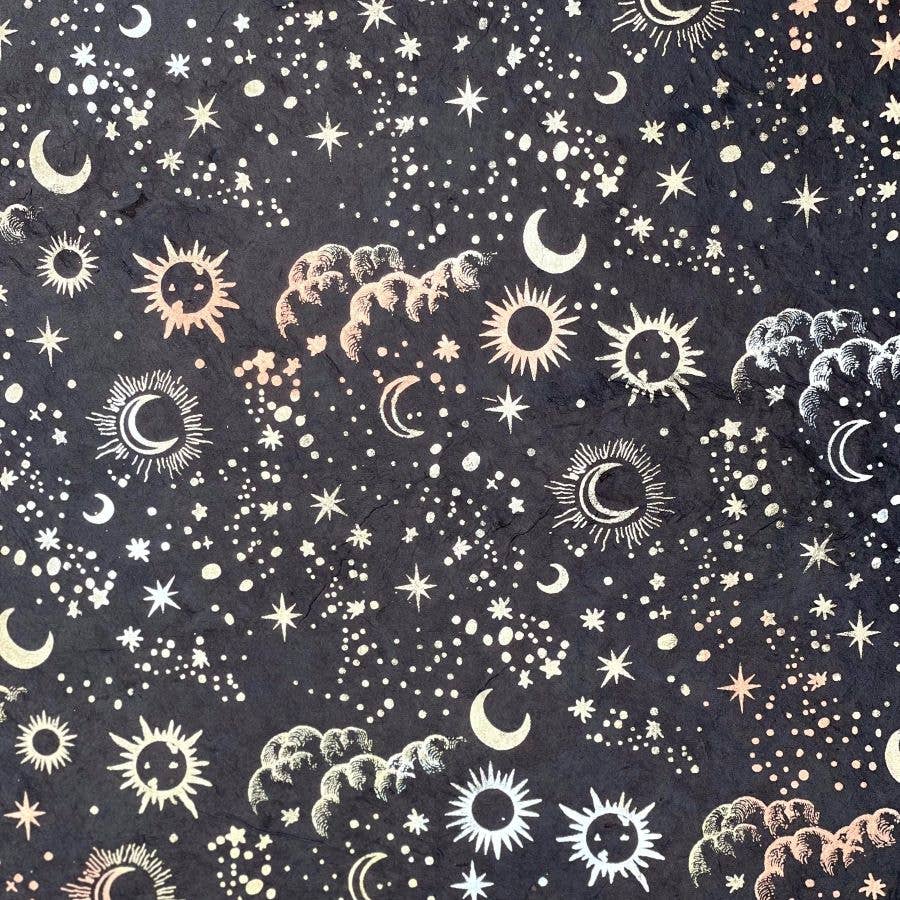 Transform your gifts into celestial treasures with our Solar System Wrapping Paper. Spangling stars, asteroids, orbits, and planets – are printed in shimmering silver on a black background. Skilled artisans craft each sheet of this handmade paper at a women's cooperative in Nepal's Kathmandu Valley. It's the perfect way to elevate your gift-giving. This wrapping paper comes in pre-cut 20 inch x 30inch | 50 cm x 75 cm sheets, they are not on rolls.