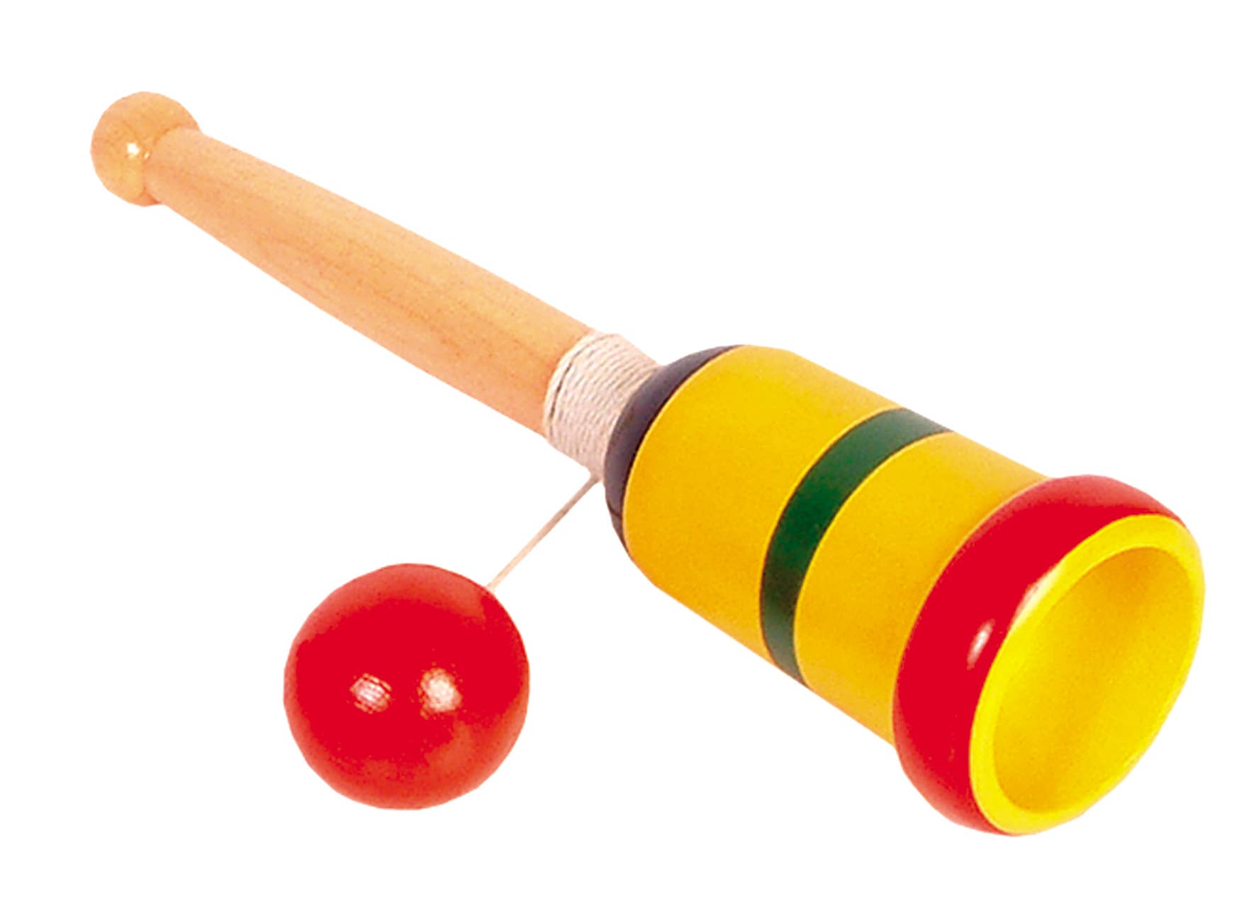 Mexican Wooden Toy Balero Cup 3.5" Traditional Fun Game for Children A cup-and-ball consists of a small ball (usually made of wood) connected to the handle of the cup by a string of 14 to 16 inches. The cup is shaped to fit the ball. The player must not use any body part other than their handle-holding arm to catch the ball. The player must not purposefully bounce the ball off their body to change its trajectory. The main goal of the game is to get the ball into the cup. While the concept is very easy, mastering the game sometimes requires many hours of practice. The player tosses the ball upward by jerking the arm holding the toy, attempting to catch the ball in the cup. 4" cup 5" stick Wood & string Balero is a version of the Americanized game of "ball & cup", where a player holds a wooden cup and tries to catch a ball which is attached with a string to the cup.