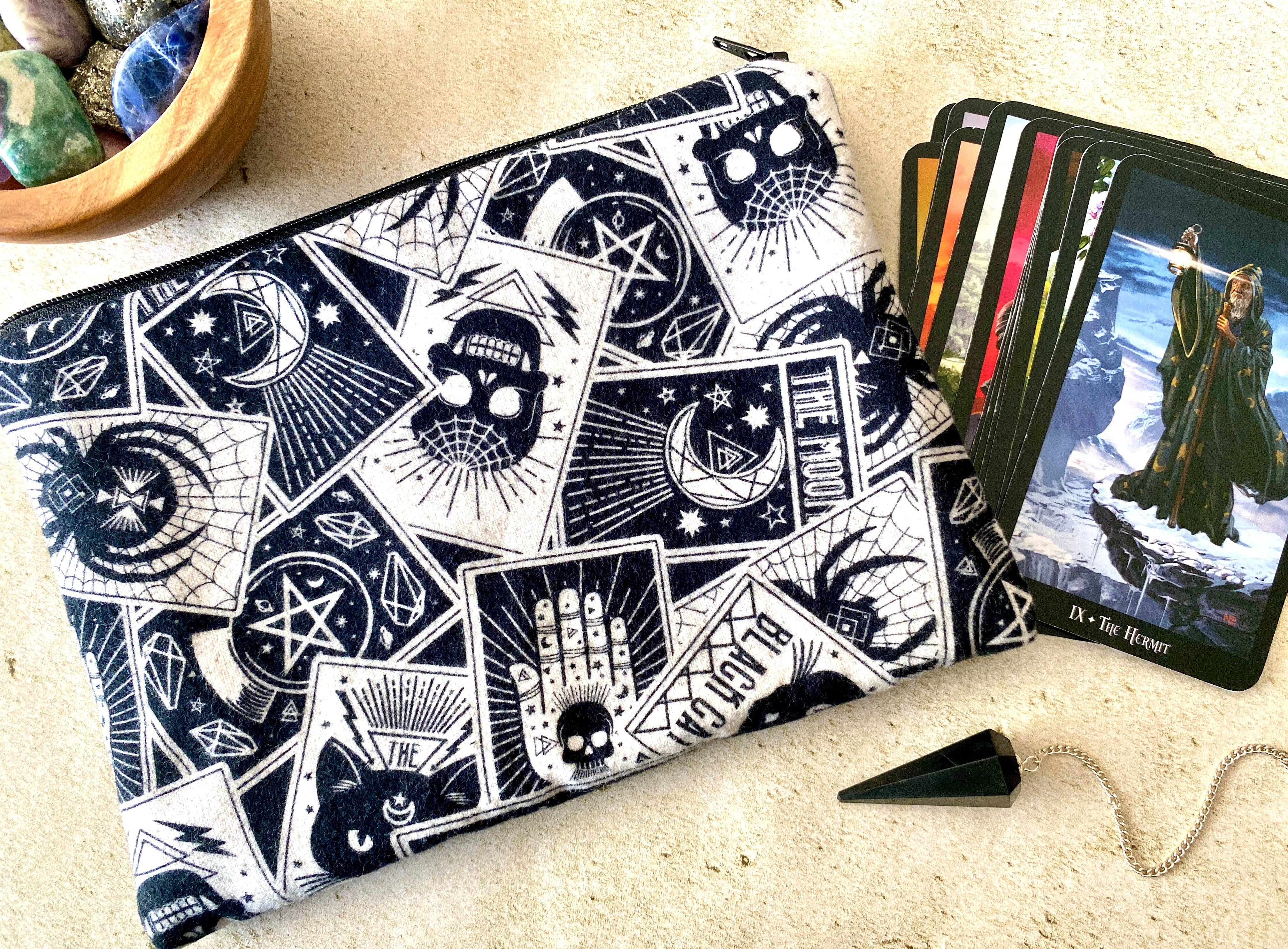 Product Code: ZTB511 This beautiful velvet zipper pouch is the perfect place to keep tarot decks, crystals, beauty products and other treasures. Features a stunning white and gold moon tarot card illustration on the front and a matching tassel and crescent moon charm on the zipper. Size: 8" x 6".