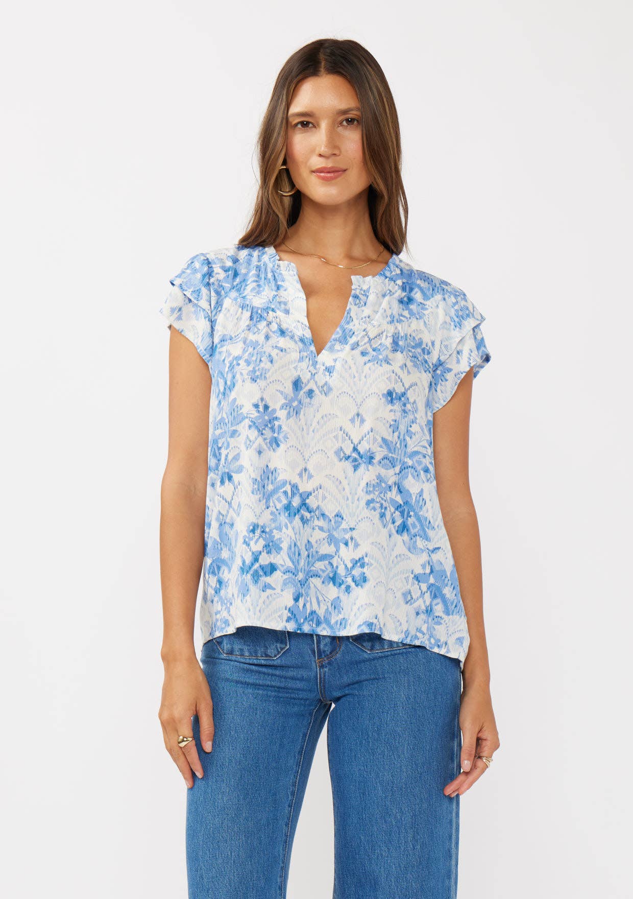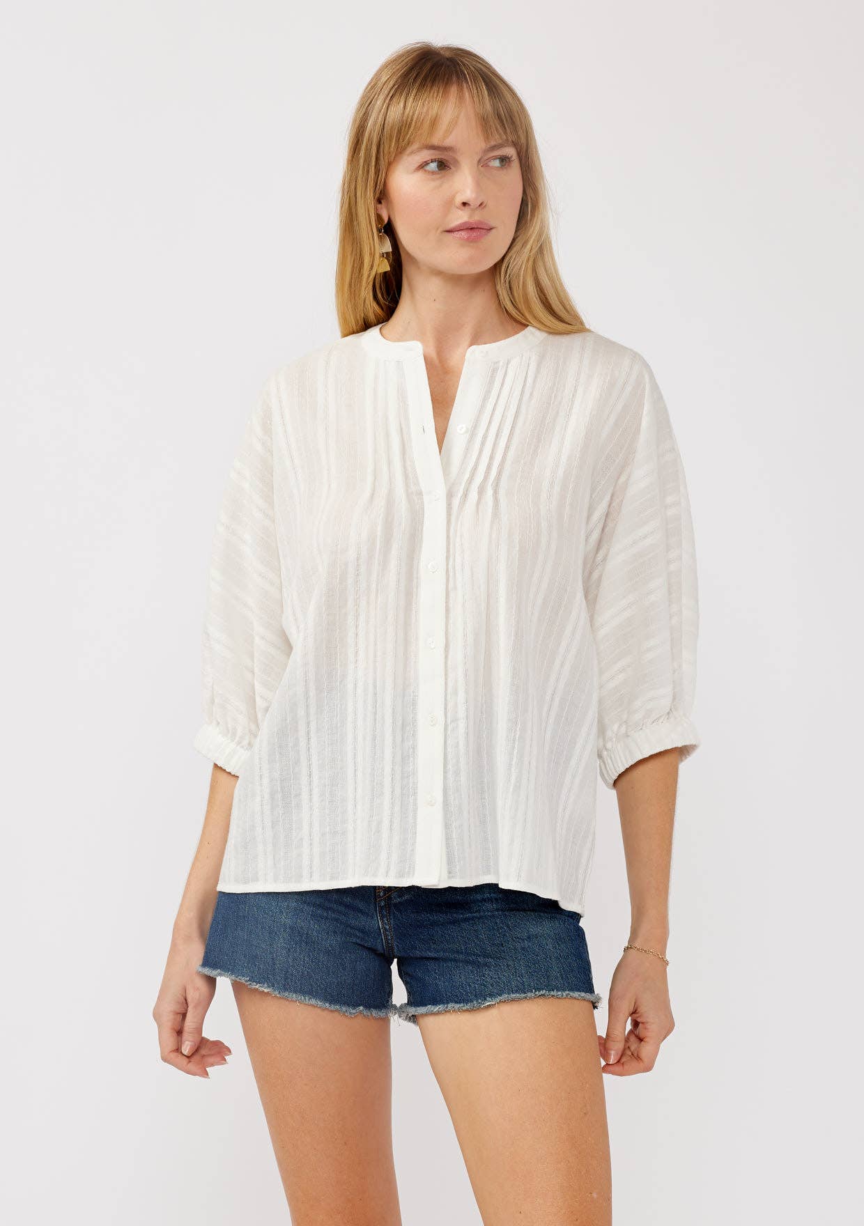 Perfect for spring, this top features a stylish split neckline adorned with a folded ruffle detail for a feminine touch. Designed in a classic yarn-dyed stripe, it includes short puff sleeves with delicate ruffles and a baby hem. The center front placket with double self-fabric and topstitching adds structure, while the straight hemline ensures a polished, versatile finish.