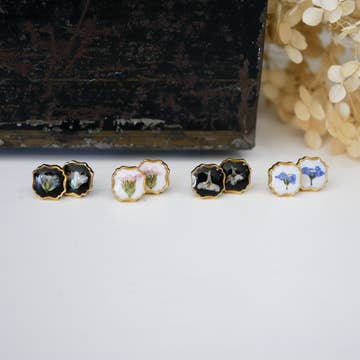 These stud earrings are handmade with real pressed flowers and then encased in resin. They flowers lay upon a piece of real wood. They are like wearing a piece of nature! Each piece is one of a kind. Sometimes we will use the same color combination, but no two are exactly alike! Studs are 12mm. Stainless steel backs, which are great for sensitive ears. Flower colors may vary. If you require specific colors, please contact us at the time you place your order.