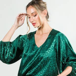 French terry raglan top with contrast leopard sleeves and side tie. Self 86% poly 10% rayon 4% span. Cont 95% poly 5% span. MADE IN USA