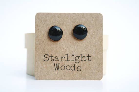 Black geometric stud earrings made from wood. These earrings are made from a fallen tree branch. Hand cut, hand sanded, then sealed to protect with a coat of resin. Earring posts are titanium so they are perfect even for the most sensitive ears.