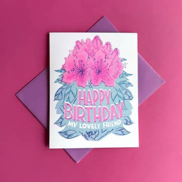 This simple birthday card design comes from an original block print and is printed on high quality felt weave paper. The lowers spill over the back, giving this a unique element. Comes with a protective sleeve to ensure it will remain smudge free in your shop! If you're looking for a good selection of birthday cards that work together as a series, consider "Hoppy Birthday", "Birthday Lilac", "Birthday Wildflower" to compliment the "Birthday Rose." • Size : 4.25” x 5.5” / A2 Envelope • Heavy Felt Weave Paper / 80lb. Cover • 30% Recycled Content • 100% Recycled Content Matching Envelopes • Blank on the Inside