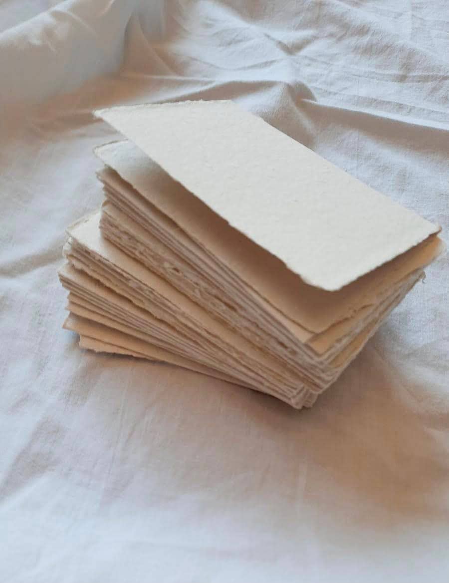 BULK Handmade paper orders may have up to a 3-4 week production turnaround time due to the paper making process. To inquire about quantities and turn around times, please send us a message. our handmade paper is available in bulk stacks of 50 blank sheets for use in creative projects or to add a natural element to store displays. these may be offered to customers in quantities or by the sheet. non-deckled edges are available with a cutting fee. - 3.625 x 6 inch handmade recycled cotton paper with natural deckled edges. - bulk set of 50 sheets - bulk does not include envelopes or sleeves - this paper is designed for letterpress printing and will not perform well in an ink jet or laser printer