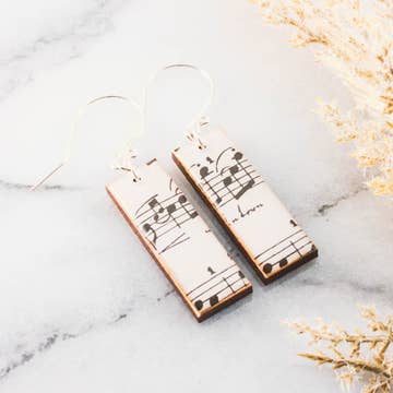 Beautiful whimsical white washed wooden earrings adorned with embossed silver music notes.