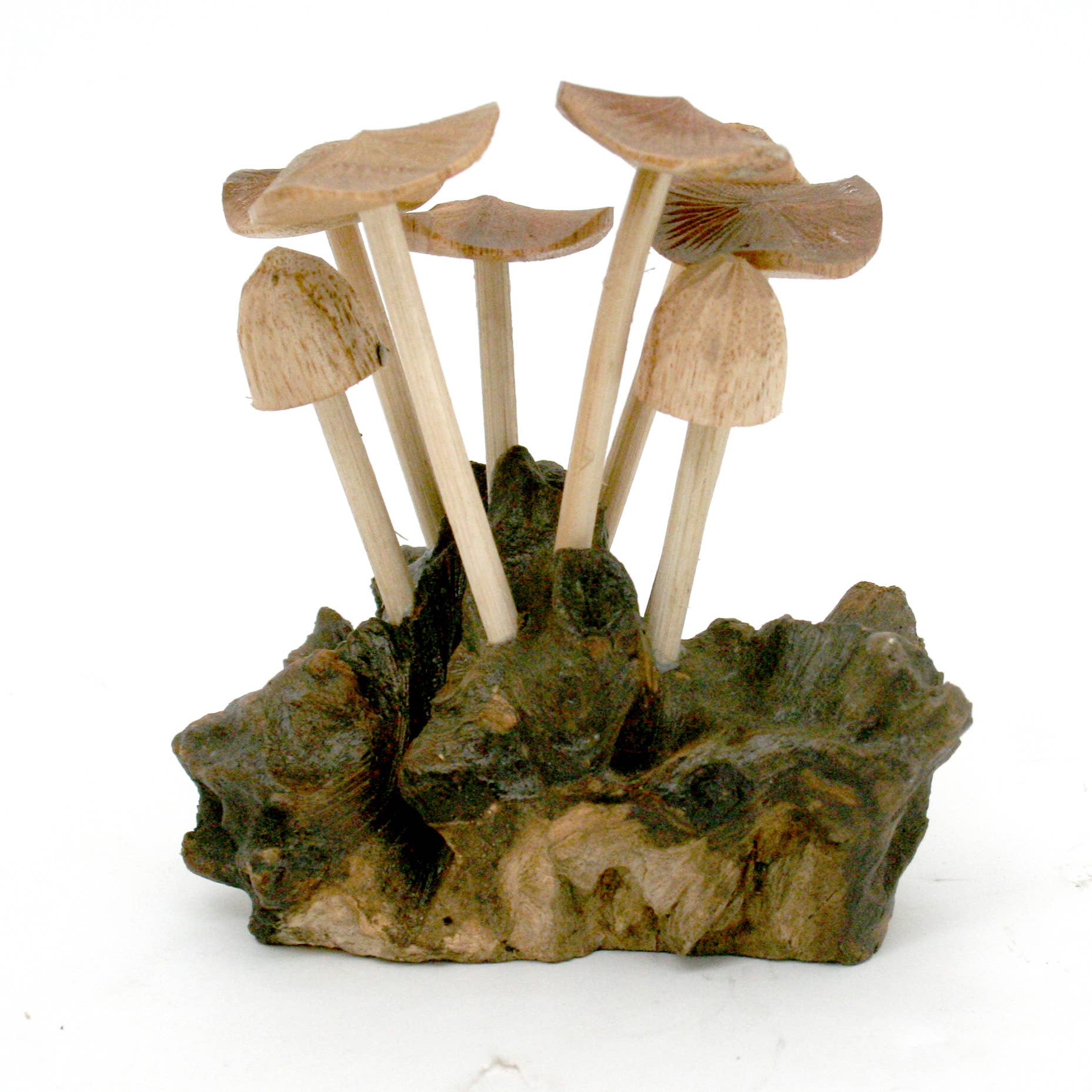 Four (4) Parasite Wood Flat Mushrooms , hand carved from Indonesia. This is a natural item that will have variance in actual size and placement of mushrooms. The quantity of mushrooms will be accurate, and the actual shape of the wood will differ for each individual item. Size is approximately 7x7x12" H.