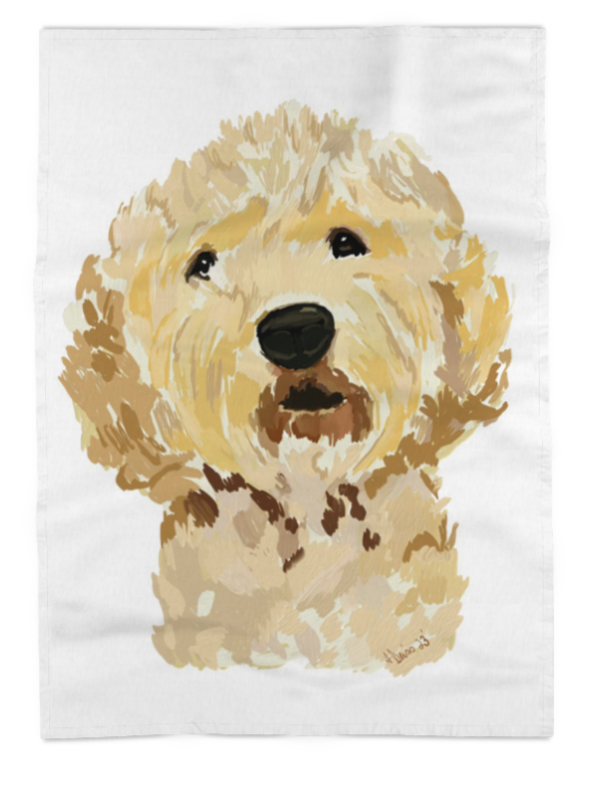 Custom Brown Cockapoo tea towel. Tea towel is made of absorbent and durable 100% premium cotton. Towel measures approximately 27"x27" with a corner loop for convenient storage or hang drying. The image is put on the towel with a commercial heat press and heat transfer paper Our tea towels make a wonderful way to bring your personality into the room, and you can't help but love them! No two towels are exactly alike.