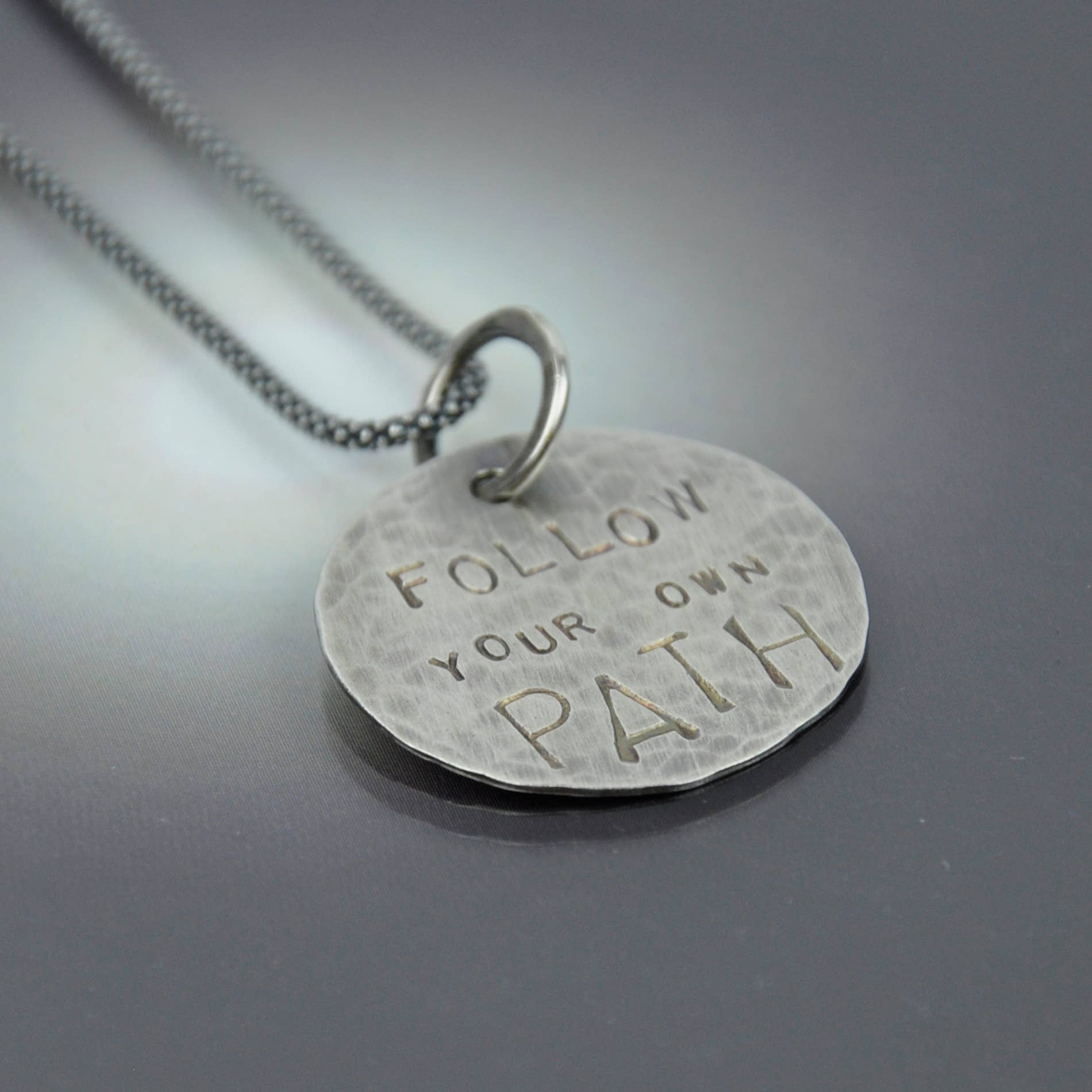 This stunning necklace consists of a handcrafted ring with a plaque overlay that states "Follow Your Heart", A sweet little hammered heart is hand wrapped onto the ring and is finished with a textured sterling link chain with a lobster clasp and a 2" extender. The piece is aged with a hand-applied patina and created by me in my MN studio.