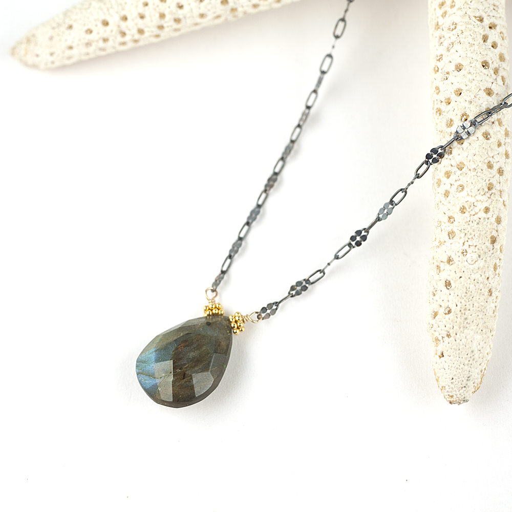 Gold fill and blackened Sterling necklace with Labradorite gemstone pendant. You can purchase a gold 3" extender