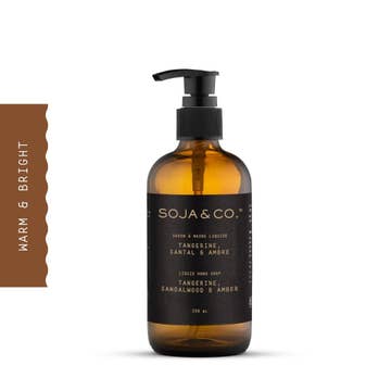 SOJA&CO.'s hand soaps are hand-poured in Quebec using exclusive, phthalate-free vegan fragrances. Their moisturizing formula is made with certified organic sunflower and coconut oils. Free from GMOs, parabens, and animal testing, each soap comes in a reusable and recyclable amber glass bottle. Fragrance description: A sophisticated blend that’s both uplifting and enveloping, where the vibrant zest of tangerine meets the creamy warmth of sandalwood and the softness of amber. Top notes: Tangerine, Orange zest Heart notes: Sandalwood Base notes: Sweet amber, Musk ingredients: Aqua, Potassium Cocoate, Potassium Oleate, Decyl Glucoside, Glycerin, Parfum (Fragrance), Benzyl Alcohol, Potassium Citrate, Sodium Chloride, Citric Acid