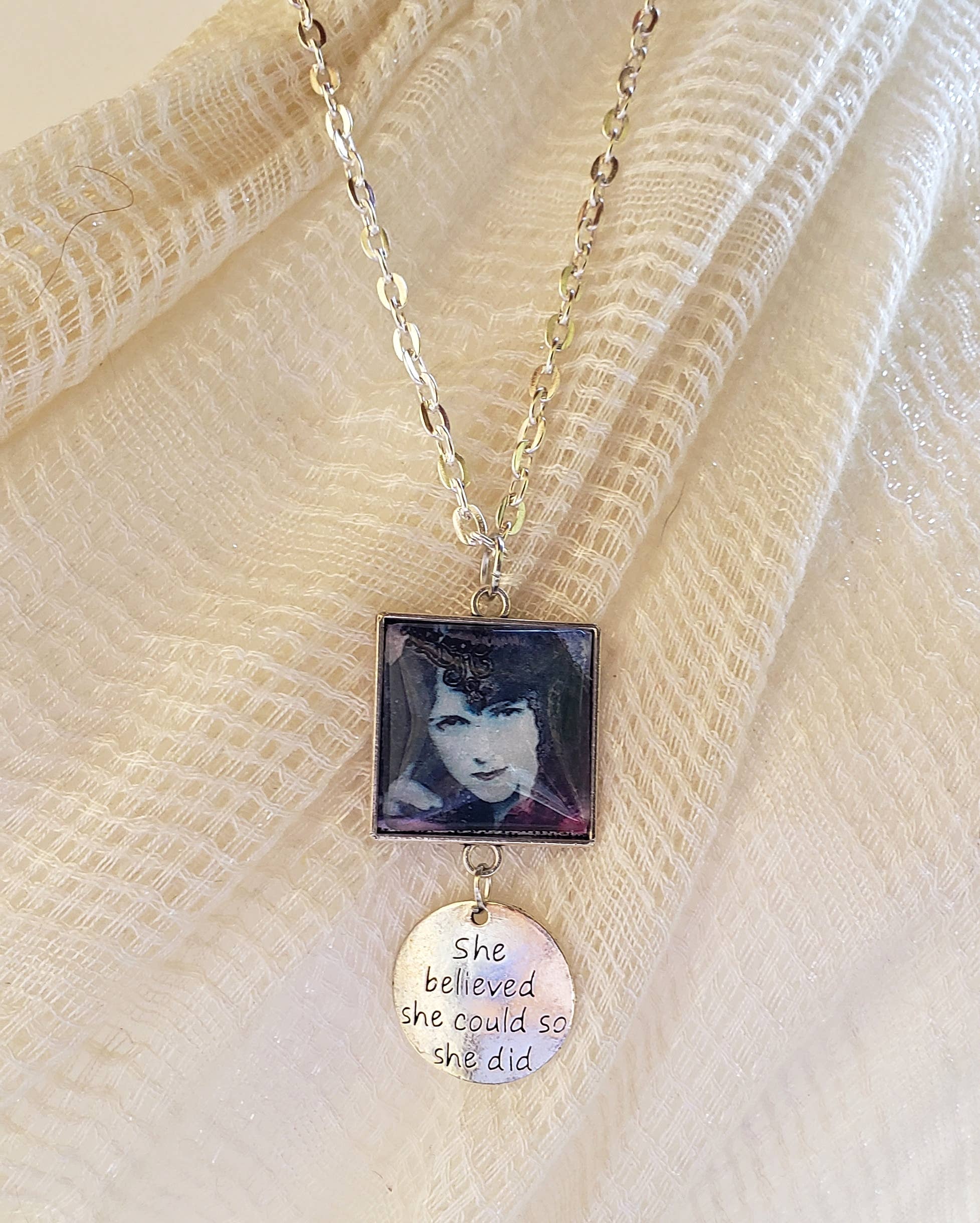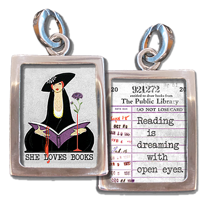 Created from the original book cover, our two-sided soldered charms are hand soldered in our Minnesota studio, so little variations are not only accepted, but expected and add to the charm of the piece. Materials: recycled glass, paper, lead free + jewelry grade solder. Dimensions: Soldered charm 1" x 1.5". Complete Necklace option includes a 30" ball chain with ball chain connector and a freshwater pearl. Please note: This listing is for one piece only. The photos show both the front and back side of the charm. You can purchase the complete necklace, or you can purchase just the charm. We sell chains separately to give your customers the option to mix and match multiple charms on their necklaces and build their own necklaces.