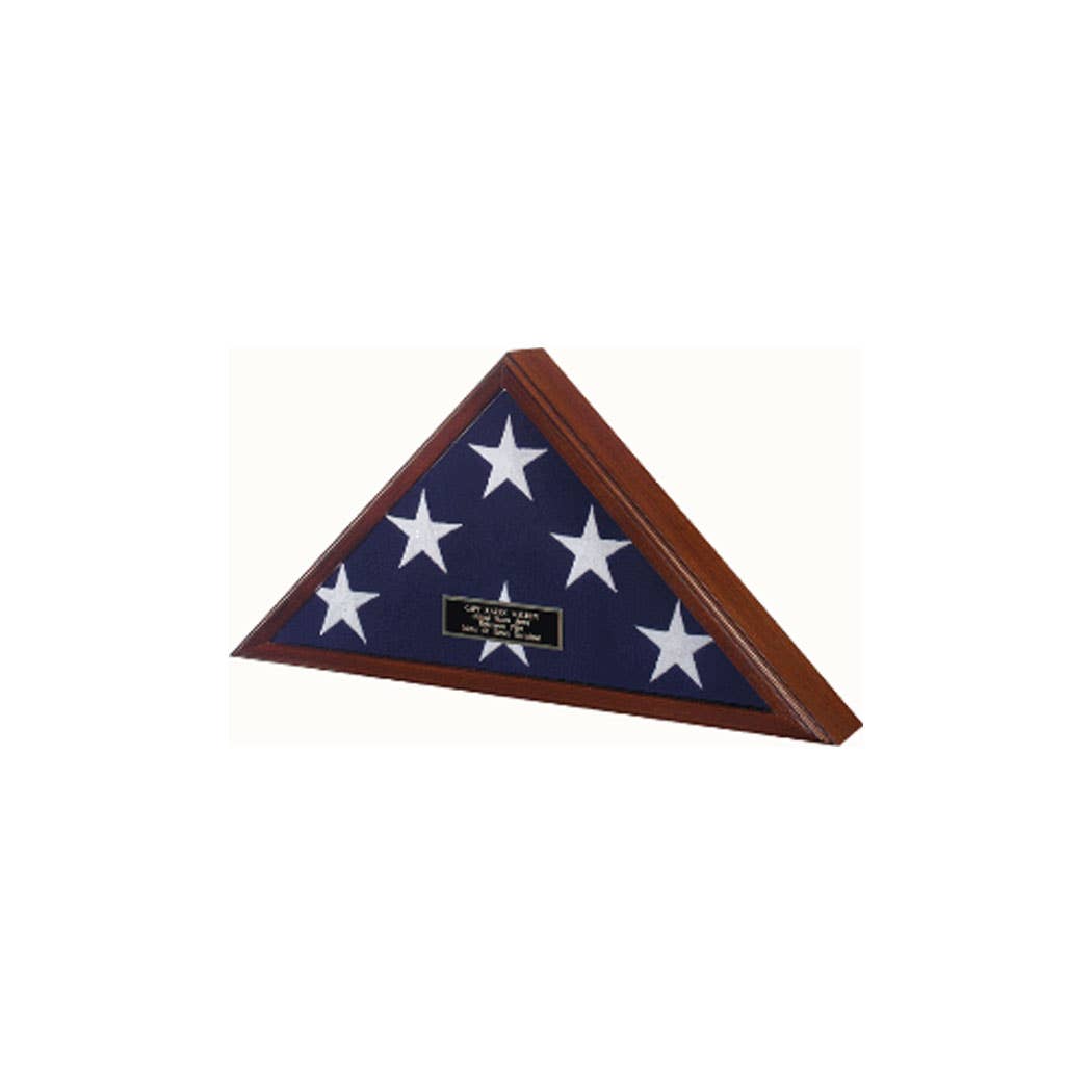 Our premium-quality American flag and medal display case allows you to create your own memorial to a hero. Show your loved one’s flag and medal's in this beautiful wooden military flag display case. With superior craftsmanship artfully displays a 5' x 9.5' tri-folded flag behind its glass window. Additionally, a 4"x 6" picture frame is the perfect touch to finish the memorial. Details include beveled edges, a clear glass front panel and hardware for optional hanging. Our display includes a very easily removable back to insert your flag and medal collection. Flag not included. Solid wood construction. Stores 5' x 9.5' tri folded flag. Stores a 4"x6" photo. Designated space to store medals and awards. ITEM#: -WD150 -WD151 -WD153