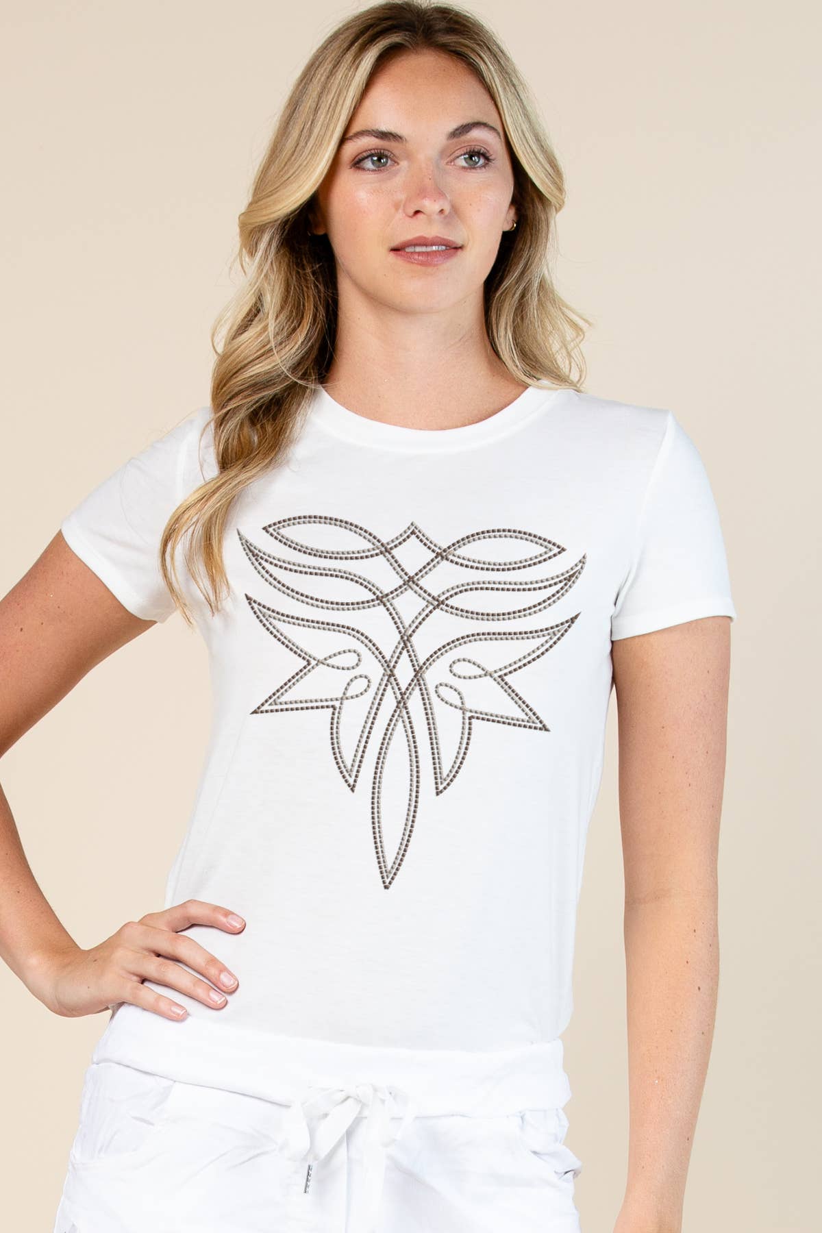 This is our signature cowl neck t-shirt in a cotton/Lycra blend, with a small slit on the side of the sleeves. The fabric is so soft and it drapes beautifully. As always, these are hand silk-screened and handmade by our little team at Matrushka.