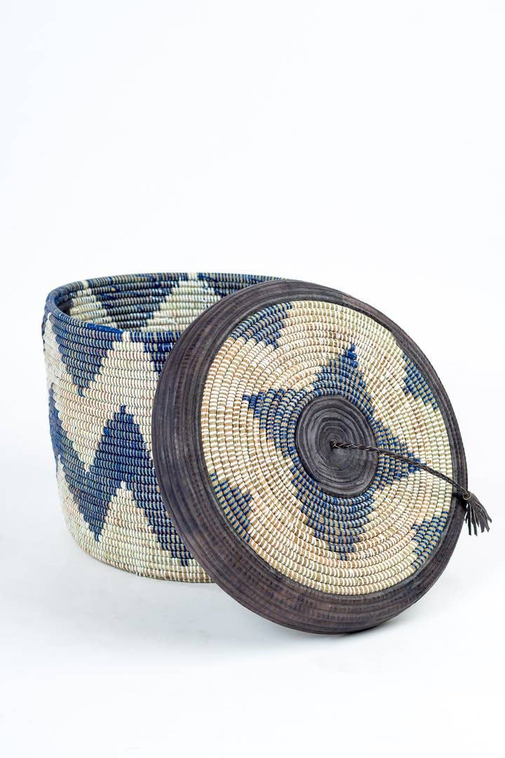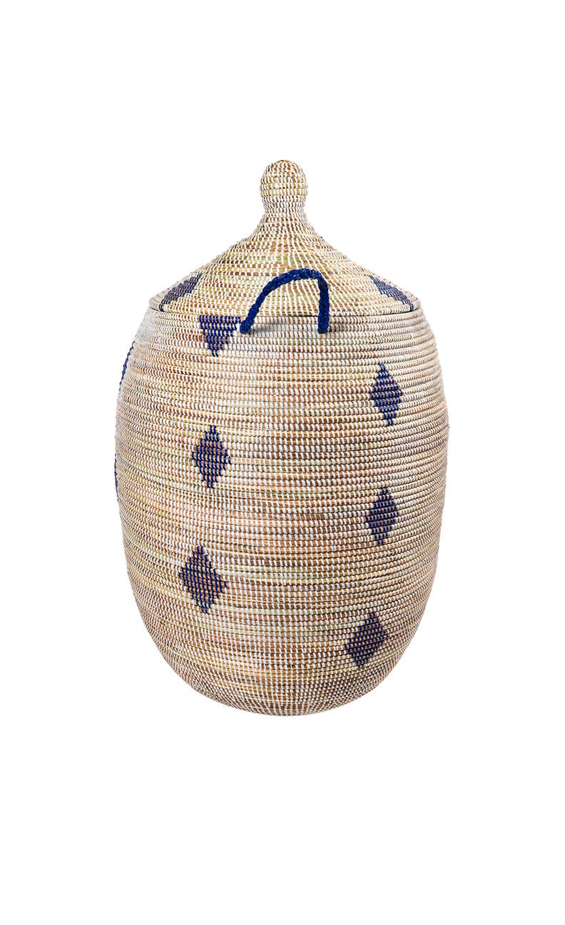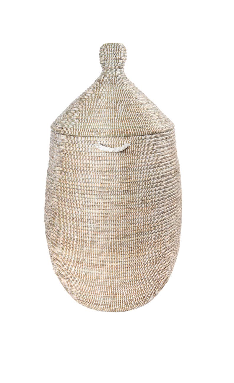 Luxe Marmite Basket - French word for Pot. This simple pot shape basket with a fancy leather trim lid. Kitchen use store dry rice or beans, serve your warm bread. Living space - use it to store your extra wires lying around head phones any of your daily used items. Bathroom use for hand towels, bars of soap, any loose items. Just let it be your floor decor while hiding loose items. SIZE: Height 46 cm / 18.1" x width 34 cm / 13.3 Clean wipe. Our baskets are handmade by the artisan women in Rural Areas of Senegal. These Artisan women have skills and traditional techniques that have been passed down through generations.They work from home, usually weaving under mango trees in the late afternoon and evening. The process of making the basket is called coiling they take the local grown grass and it is wrapped in recycled plastic strips. Making these items durable, sustainable & Eco-friendly.
