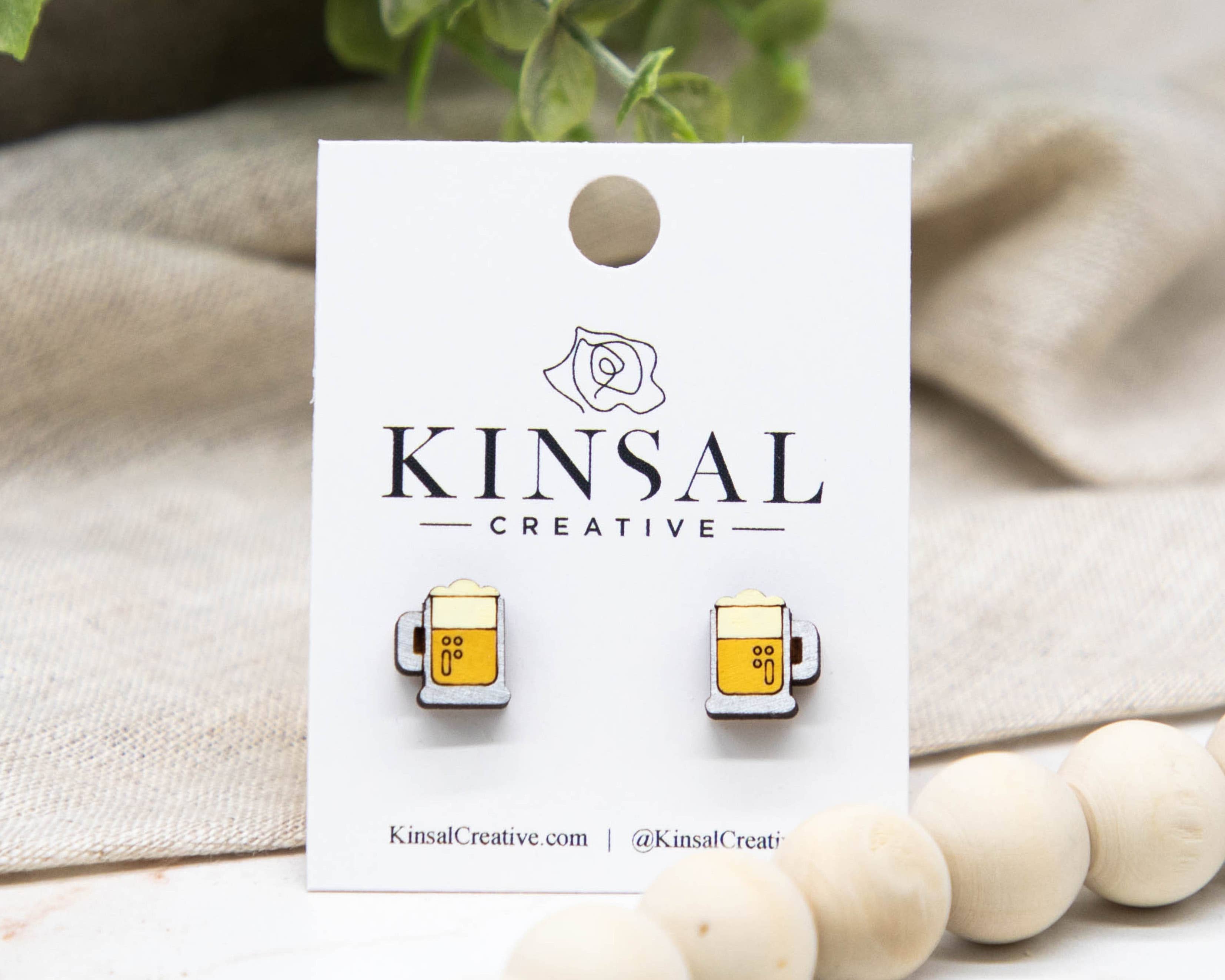 This is one mug of beer you don't have to worry about going empty. Cheers! Product Specifications Made from sustainable wood, so they're light and easy to wear all day. 18-gauge surgical steel posts for sensitive ears. Handmade by us to the highest quality in the USA Gift idea for the beer nerd in your life. The perfect size for your ears at .60" tall x .50" wide and .125" thick Beer, Beer Mug, Octoberfest, Stein, Drinking, Fun, Playful, Stud Earrings, Wood Earrings,