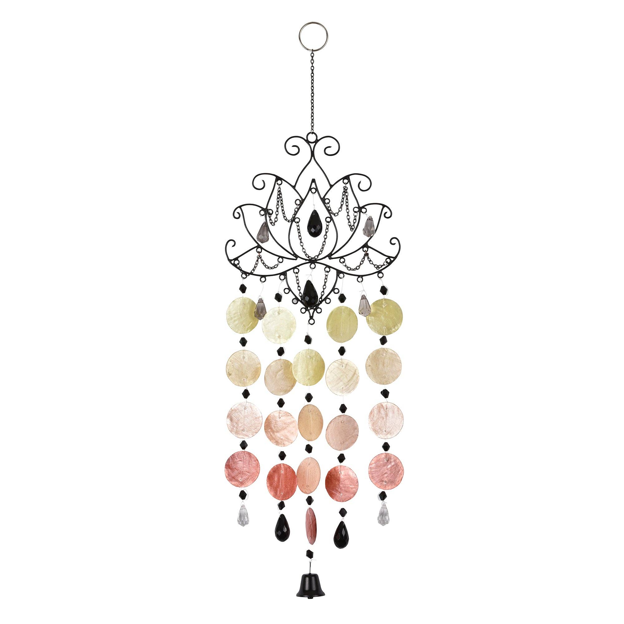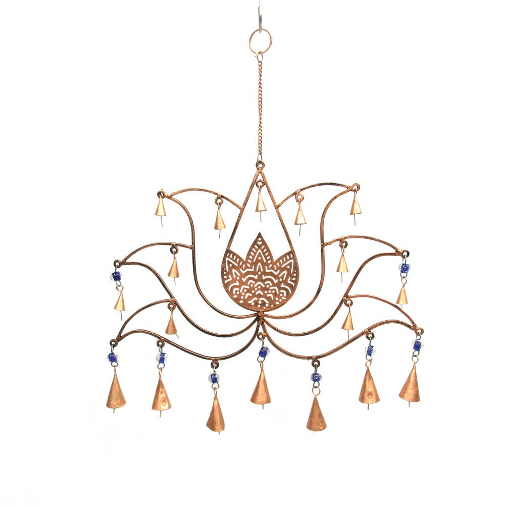 Dimensions: 30" x 10" Stunning lotus chime handmade with capiz, beads, wire, and chains. Each of the 7 main energetic chakras are represented with colored capiz shell strands, creating a balancing and visually pleasing effect. Delightful addition to an outdoor or indoor space. The significance of the lotus comes from the way in which it grows, rising above the mud to blossom into a beautiful flower. In this way, we, too, can rise above our circumstances, limitations, and earthly desires to aspire to a higher, spiritual plane. Capiz shells come from a mollusk near the Philippines. They are lovingly handcrafted into these unique, artistic pieces by fair-trade artisans who have been working with Om for over a decade.