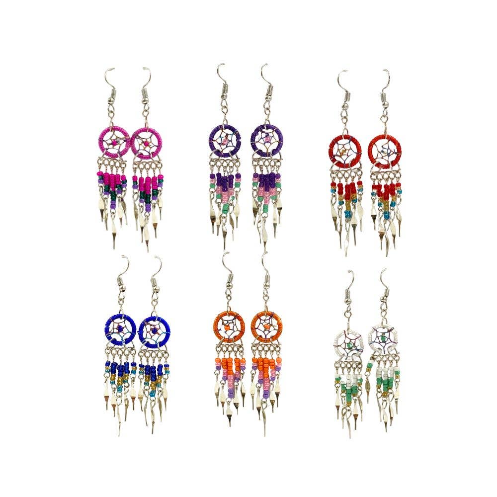 Large half crescent moon-shaped beaded silk thread earrings with long seed bead and alpaca silver metal dangles. Surgical steel hooks are hypoallergenic and lightweight for a comfortable fit. • Item code: LG-HMCM-EAR • Sold in assorted colors. • Approximately 4 inches in length. • Materials: Silk Thread, Seed Bead, Alpaca Silver, Stainless Steel • Handmade in Peru. Contact us or search our catalog to order custom display(s) of this product. Disclaimer: Each one of our products are handmade and unique. When ordering wholesale, customer will receive ASSORTED COLOR, AND/OR PATTERN variations of the product. *Specific colors are available for selected items upon request.