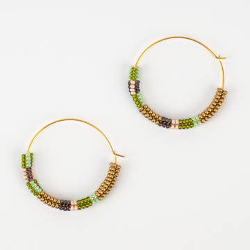 DETAILS : *35mm (1.4 inch) diameter *Materials : Premium, colorfast, Japanese glass seed beads, 14K gold-fill ear wire and findings *Post / hole closure *Lightweight, colorfast -- for everyday wear *OK to get wet, however, avoid excessive exposure to moisture, cosmetics + chemicals as they may dull / weaken jewelry over long periods of time. *Handmade with care, one bead at a time, in Cleveland Heights, Ohio :) ~ MORE INFO: Gold-fill and genuine Japanese glass seed beads combine for dainty, yet durable, wearable statement pieces. Perfect for boutiques seeking artisan stackables and collectable jewelry for women of all ages and backgrounds : our designs are minimalist pieces with playful vibes and with maximum color. Designed for retailers who want jewelry with story, craftsmanship and shelf-style appeal. Design : Lightweight, colorful, dainty and cute. Packaging : Hoops come on a branded earring card. ~ OUR STORY: On the Lookout Jewelry has been a handmade endeavor for 10+ years, rooted in translating everyday inspiration into a durable, unique, playful, wearable talisman. Based in Cleveland Heights, Ohio, each piece is thoughtfully designed, handmade by our small team of 3, and curated for independent retailers who value story-led, high-quality jewelry with personality :)