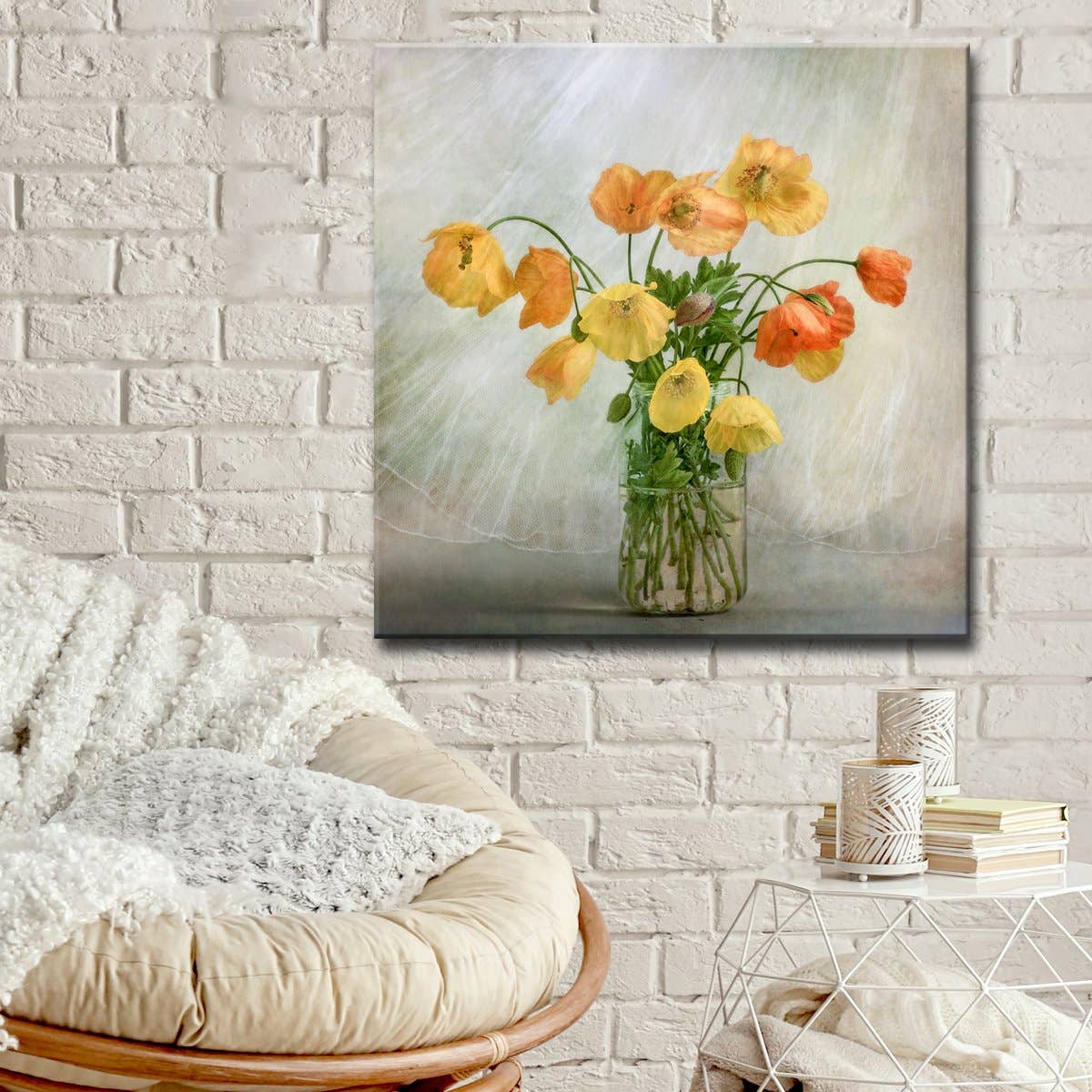 California Poppies in Vase is an original painting by artist, Noel Butler. This painting is painted in a contemporary impressionist style with pastel colors for a light and airy feel. This painting is available in an 8 x 10 high quality art print with a matte finish.