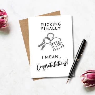 Hope your new neighbors aren't complete assholes. Congrats on your new home!. Reasons you need this card: Purchased a new home. Retired. Lost weight. Recent empty-nesters. Each card is handmade with high-quality acid-free cardstock using laser-printing, archival adhesive, and embellishments. Cards are all blank inside and are shipped with a recycled envelope in an eco plant-based cellophane sleeve. [card size] 4.25 in x 5.5 in - a2. [envelope color] recycled kraft brown. [envelope size] 4.375 in x 5.75 in - a2. [material] paper. [inside] blank.