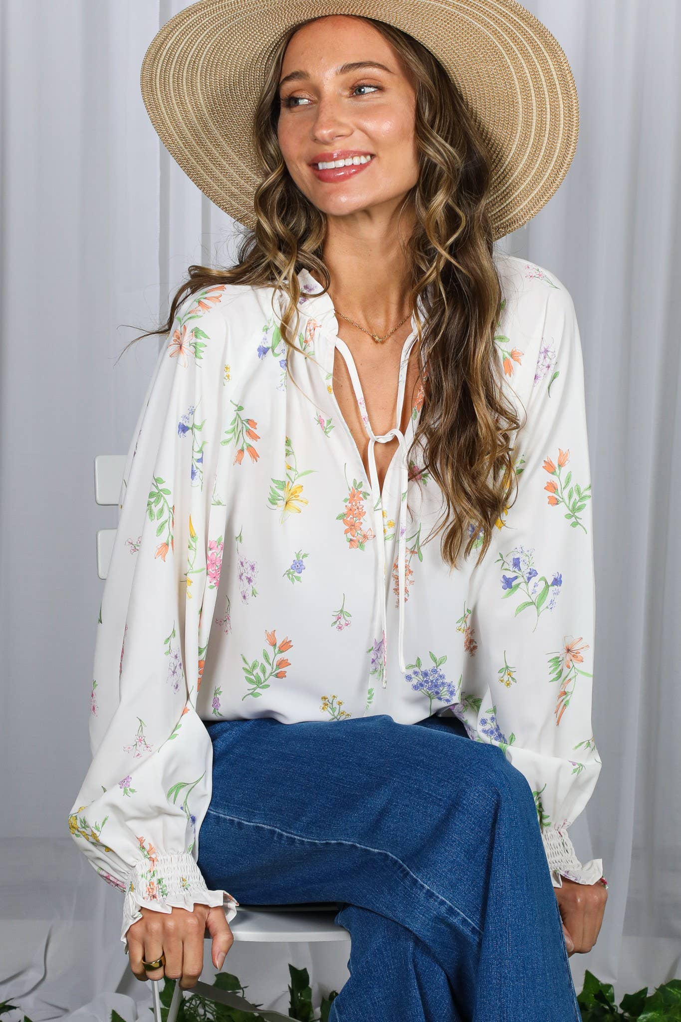 This floral blouse provides a fresh and stylish look. Delicate ruffles for a feminine and romantic touch. Trendy bubble sleeves add a chic and modern flair. Flattering V-neckline enhances the neckline. Wholesale blouses strike the perfect balance between chic and casual.