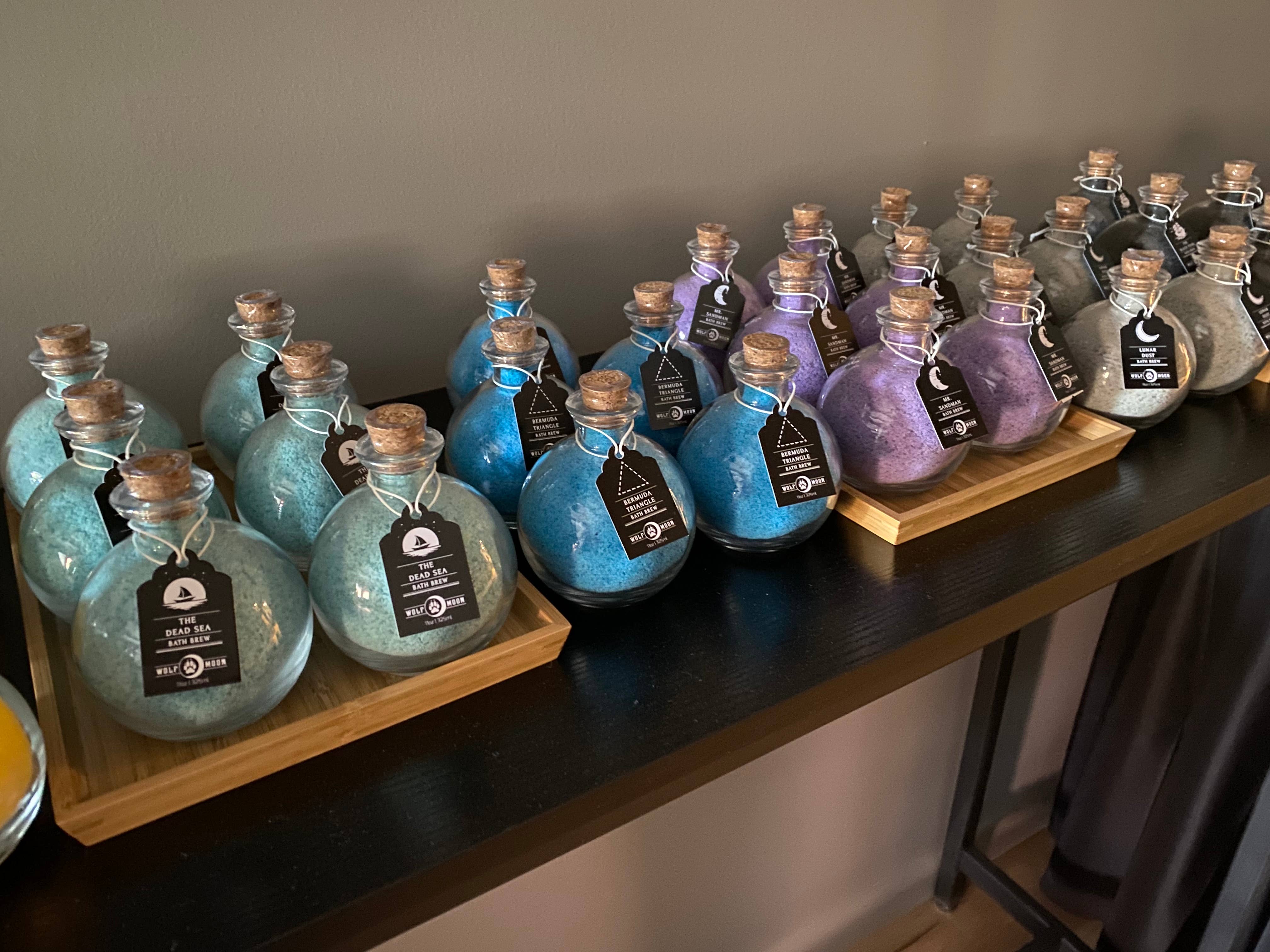 These bath potions are stunning! Very well packaged and delivered smoothly. My customers already love them and they have only been available for sale for a few days. I’m super impressed and will definitely be ordering more! Thank you Wolf Moon!!